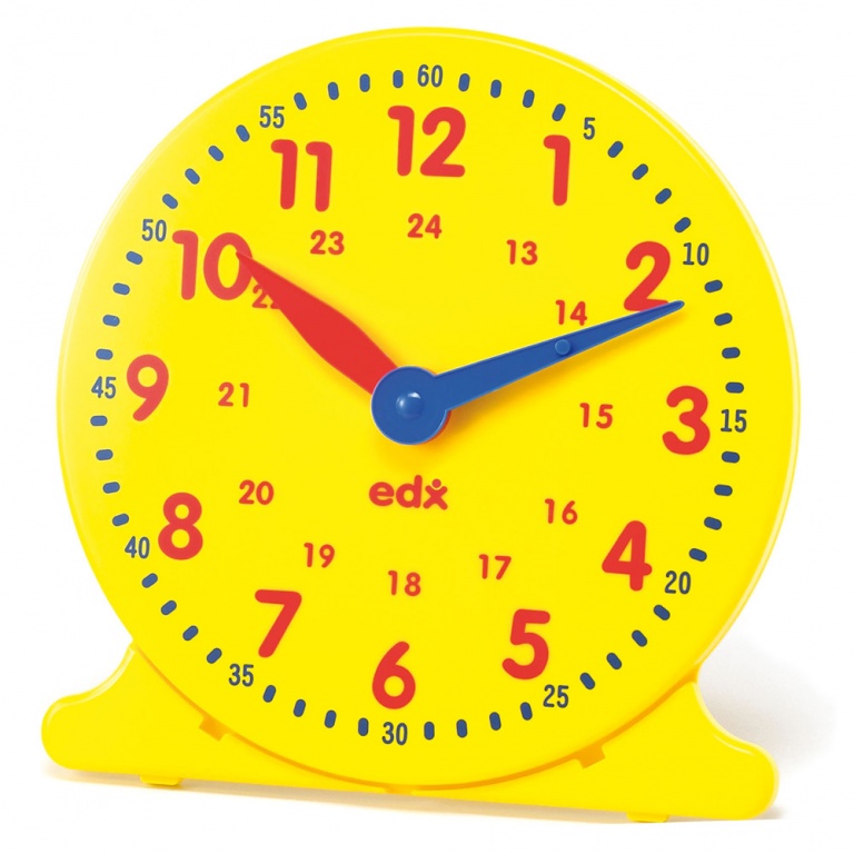 Små klockor av plast som ryms på bänken i klassrummet. Diameter 10,5 cm. Synkroniserade visare. 6-pack.