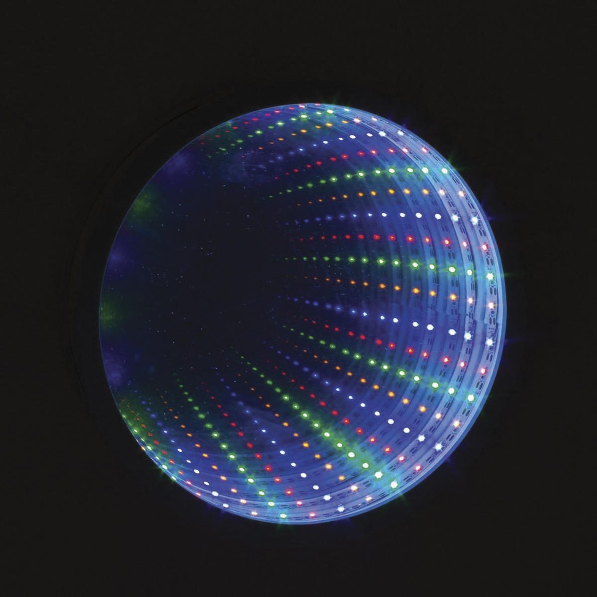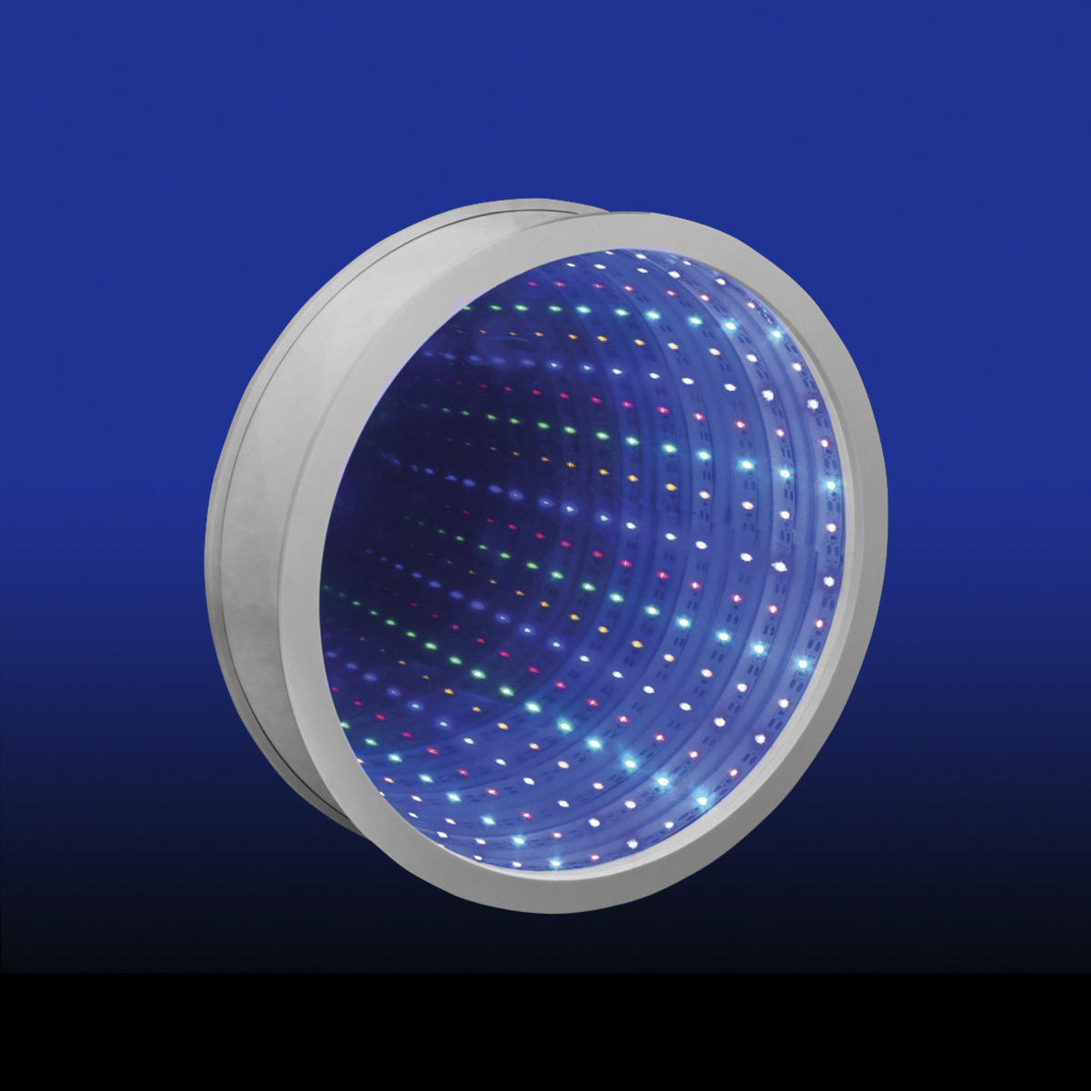Skapa en lugn och avslappnad miljö med denna runda spegel med färgade LED-lampor och reflekterande speglar som gör att man får intryck av att den fortsätter oändligt.