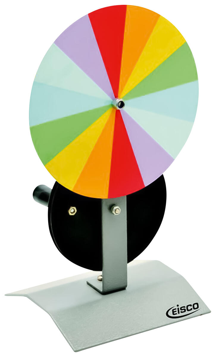 Sju färger i två serier. När skivan roterar snabbt blir den vit. Mått: ø 17 cm. Handdriven rotationsapparat ingår.