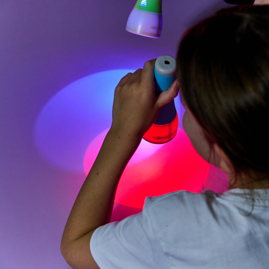 Ett set med 6 laddningsbara ficklampor i fyra ljusfärger: blå, röd, grön och vit. De ger en klar ljuskägla med bra skärpa och är perfekta för aktiviteter som utforskar ljus och färg. Lamporna laddas enkelt i den medföljande dockningsstationen och har en driftstid på ca 3,5 timmar per full laddning.