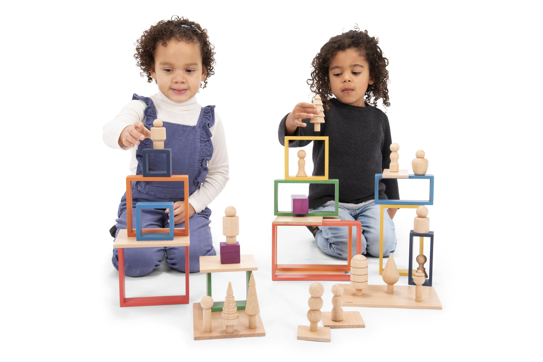 Träd i olika former och storlekar tillverkade av naturligt bokträ. Låt barnen lära sig om likheter och skillnader, eller komplettera byggleken. Inkluderar bomullspåse för enkel förvaring.