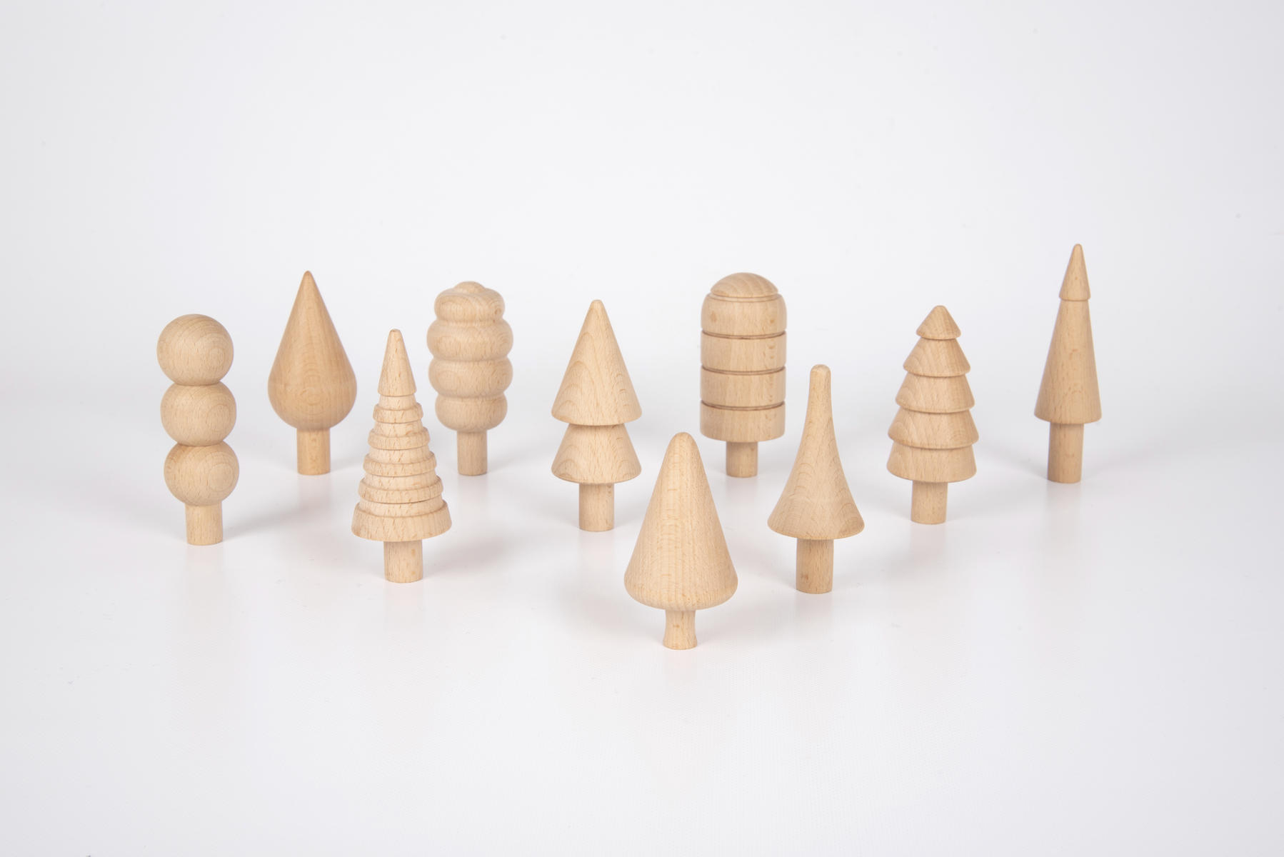 Träd i olika former och storlekar tillverkade av naturligt bokträ. Låt barnen l&a...