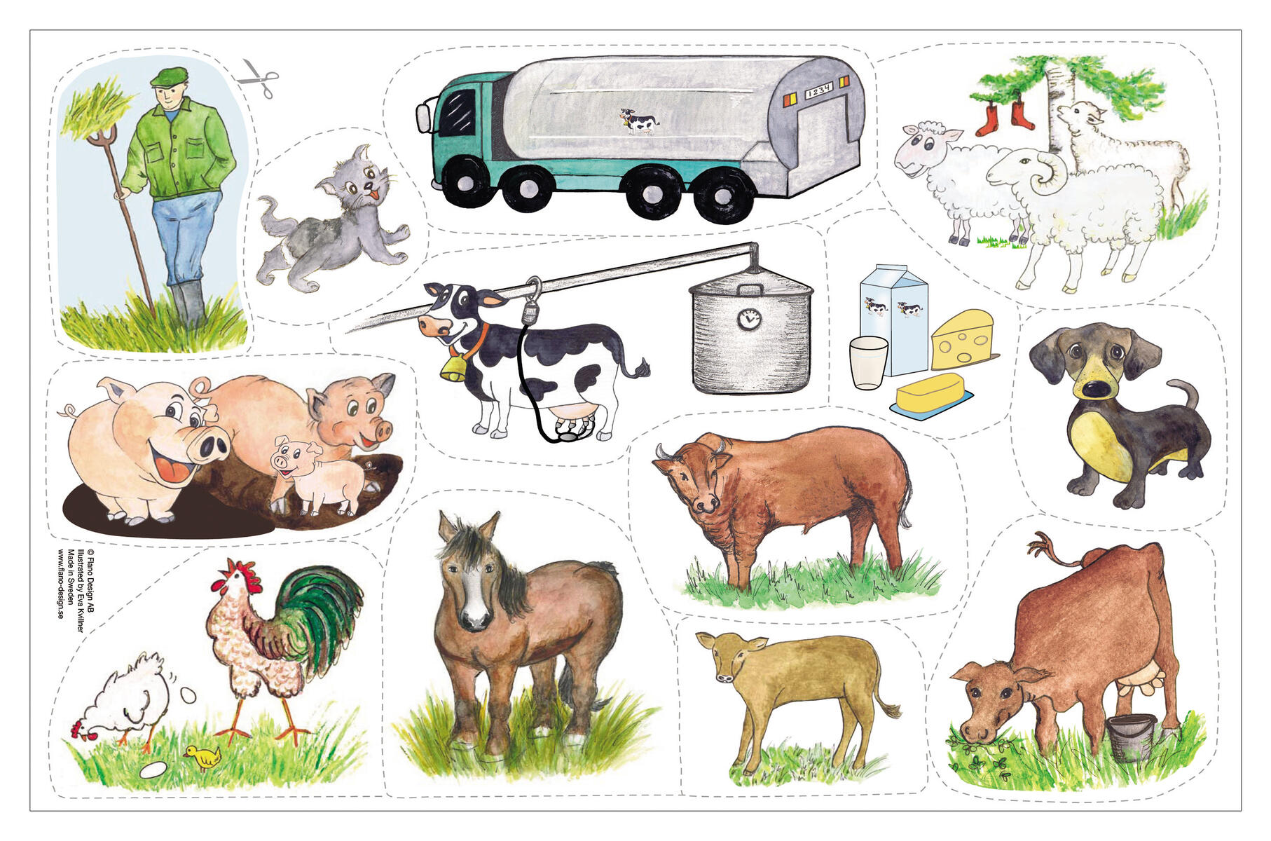 En flanosaga om bonden Alfred och alla hans djur på bondgården. Sagan och bilderna berättar på ett enkelt sätt om djurfamiljerna på bondgården och var t.ex. mjölken kommer från och hur den hamnar i våra mjölkkartonger. Innehåller 13 bilder och en saga. Av FSC-märkt papper.