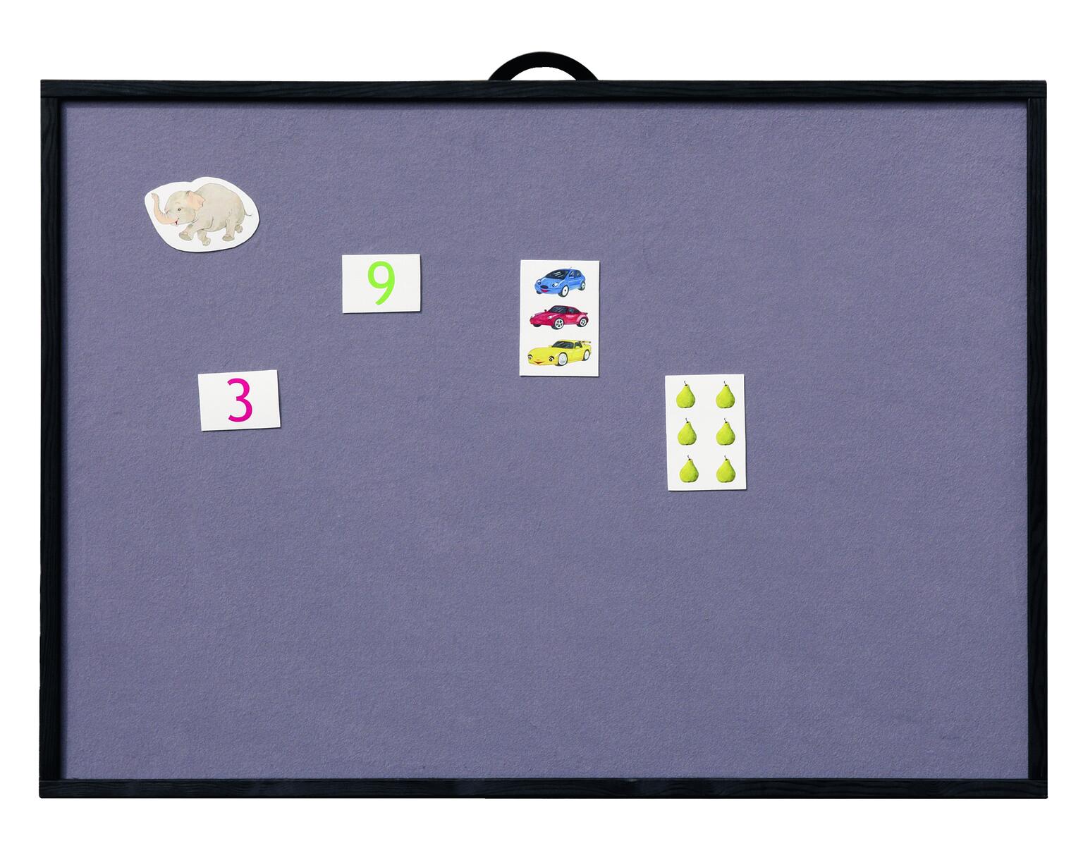 En flanellograftavla klädd med grå filt och svart träram. Med stödben på baksidan så att den kan stå fritt, samt svart upphängningsband om man vill hänga den på väggen. Mått: 90×80 cm. Av 3 mm MDF-skiva.