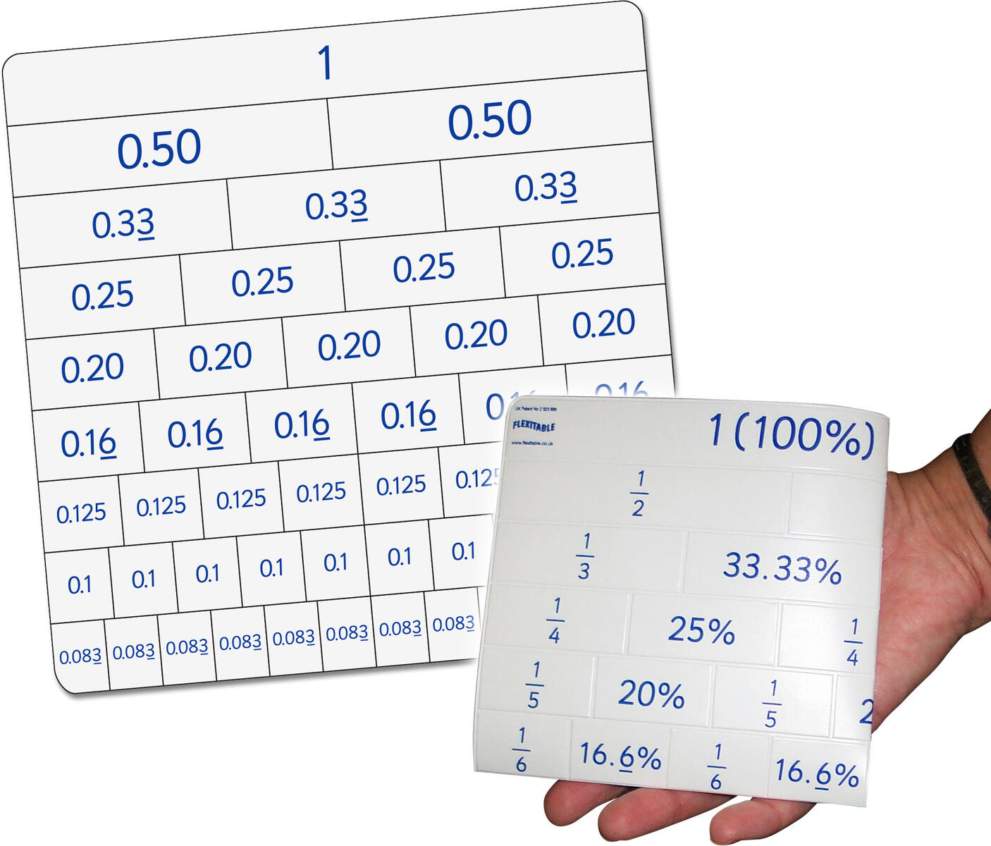 Flexitable är ett verktyg för att träna på de fyra räknesätten, procentform, bråkform och decimalform. Genom att vika de rutmönstrade tabellerna kan eleverna exempelvis träna multiplikationstabellen på ett taktilt och bildligt sätt. Tabellerna tål att vikas om och om igen. Innehåller 1 Flexitable multiplikation, 1 Flexitable bråk och 1 Flexitable addition.