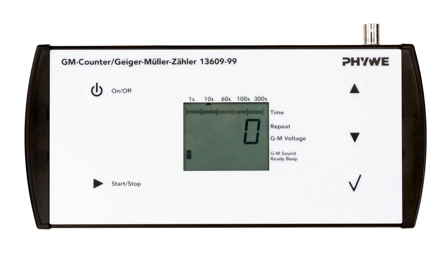 Geiger-Müller räknaren ger ett klick ljud för varje registrerad puls och en ljudsignal visar att mätperioden är över vilket är väldigt praktiskt i upprepningsläge.