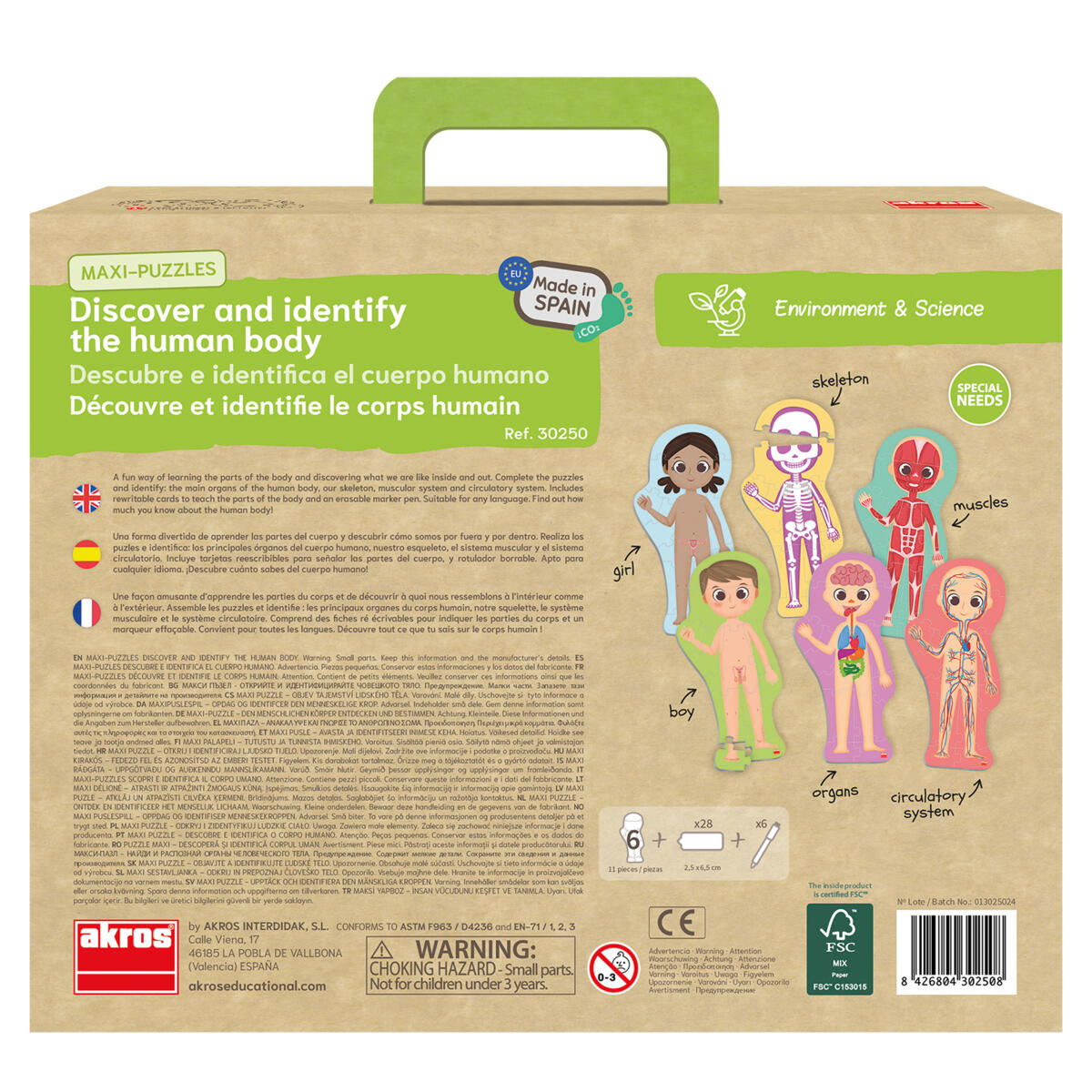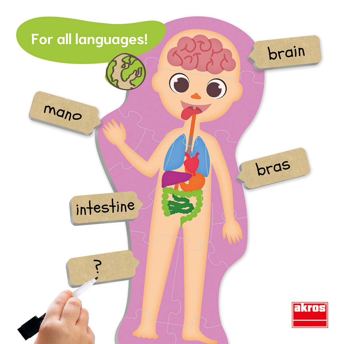 Set med 6 pussel, 11 bitar per pussel – ett roligt sätt att lära sig kroppens delar. Genom att lägga pusslen får man upptäcka organ, skelett, muskler och cirkulationssystemet. Innehåller omskrivbara kort och en raderbar penna för ytterligare inlärning. Tillverkat av FSC-märkt kartong och PVC-fritt. Från 3 år.