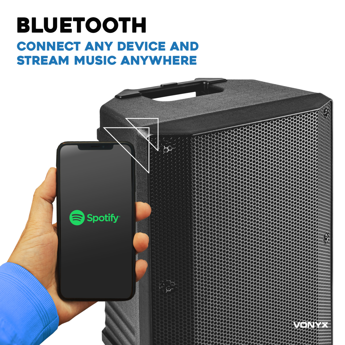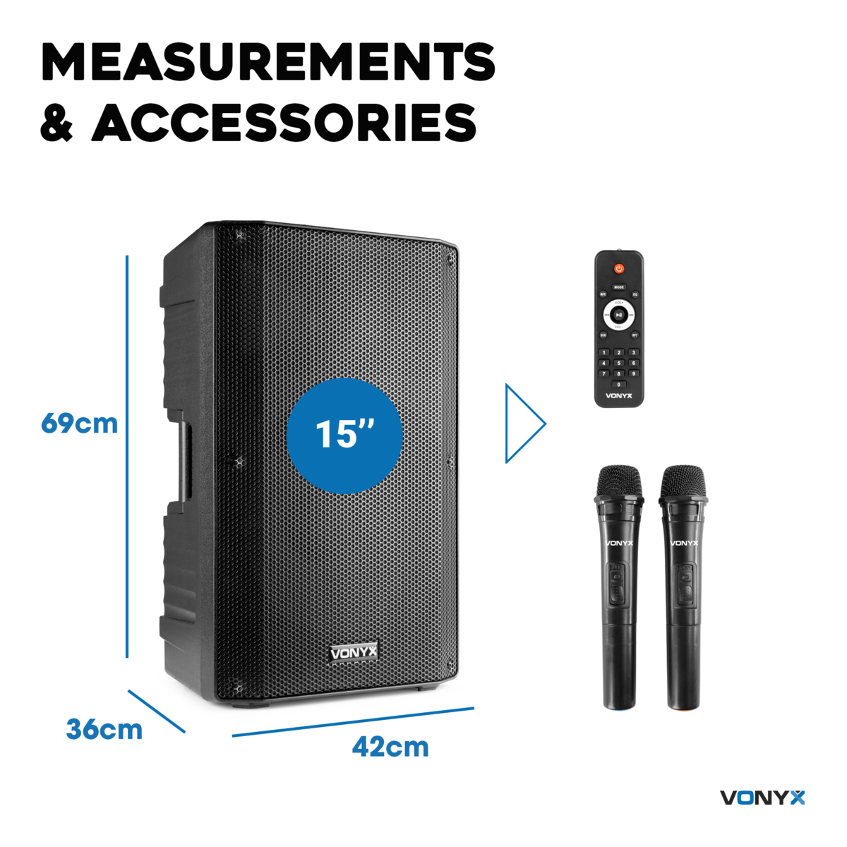Trådlös, portabel högtalare för smartphone eller platta. Koppla in de två tillhörande mikrofonerna, en mixer eller annan ljudkälla via Bluetooth. Inbyggd multimediaspelare (USB), digital LCD-display, inbyggd equalizer, gitarr-, stereo line- och mikrofoningångar samt mix output (XLR). Fjärrkontroll och kabel (4 m NL2).