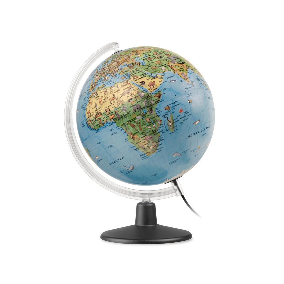 Belyst jordglob med svenska texter, illustrerad med djur och kända landmärken. Har svart plastfot och meridian i frostad plast. Diameter 30 cm. Tillverkad av ABS, PS och PVC, helt fri från ftalater.