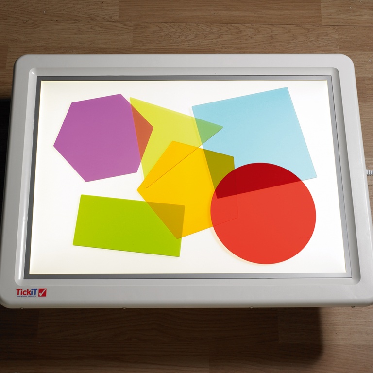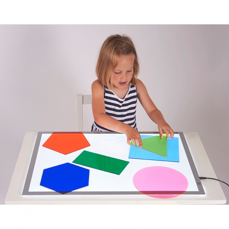 Kan användas när man ska lära sig former, färger och se olika färgblandningar. Passar bra på ett ljusbord för största effekt.