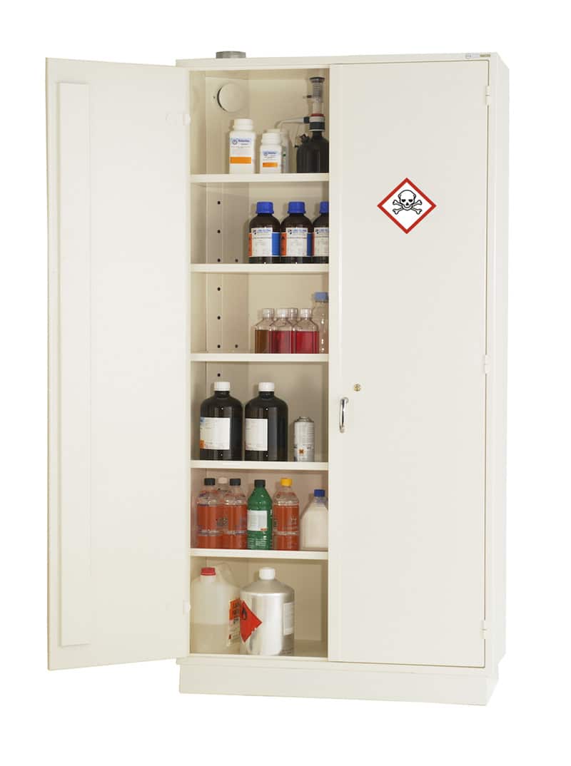 Skåpet har flyttbara hyllor med uppvikta kanter och slutna hörn för att förhindra avrinning vid spill.Det kan också utrustas med ett uppsamlingstråg om man förvarar större dunkar.