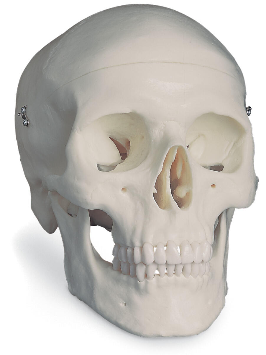 Modell av människokranium i tre delar. Huvudskål och underkäke är avtagbara. Längd: 20 cm Bredd: 13,5 cm Höjd: 15,5 cm Vikt: 0,8 kg