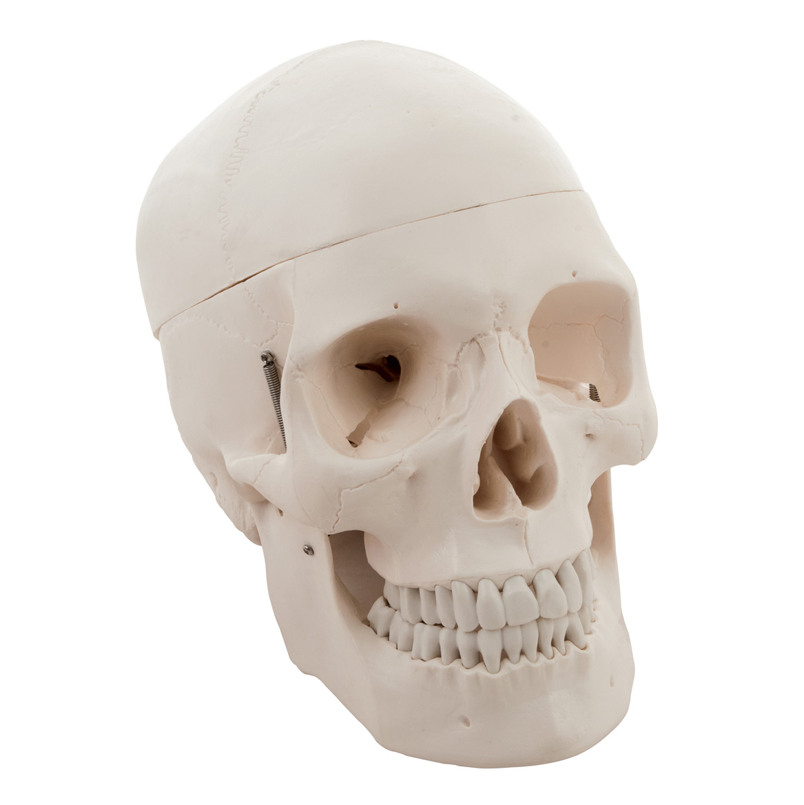 Kranium av människa i naturlig storlek med avtagbar huvudskål. Mått: 23×13 cm.