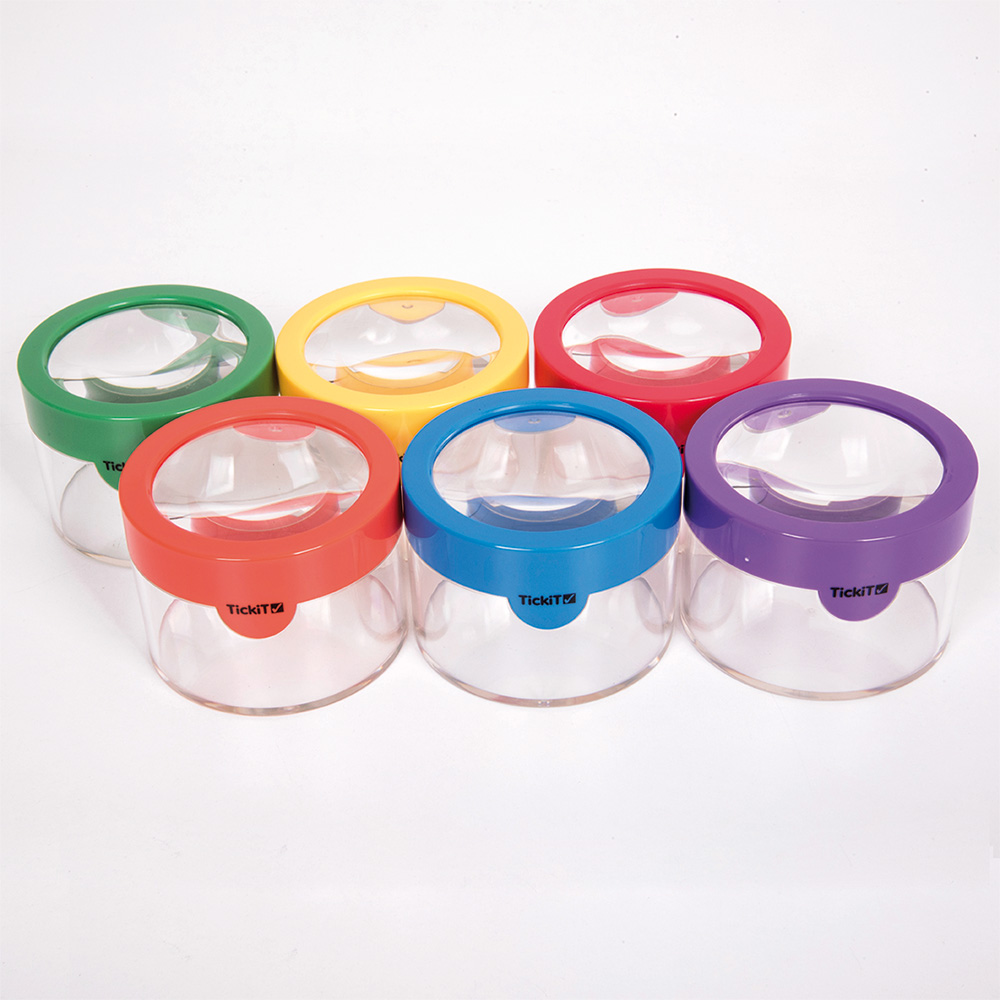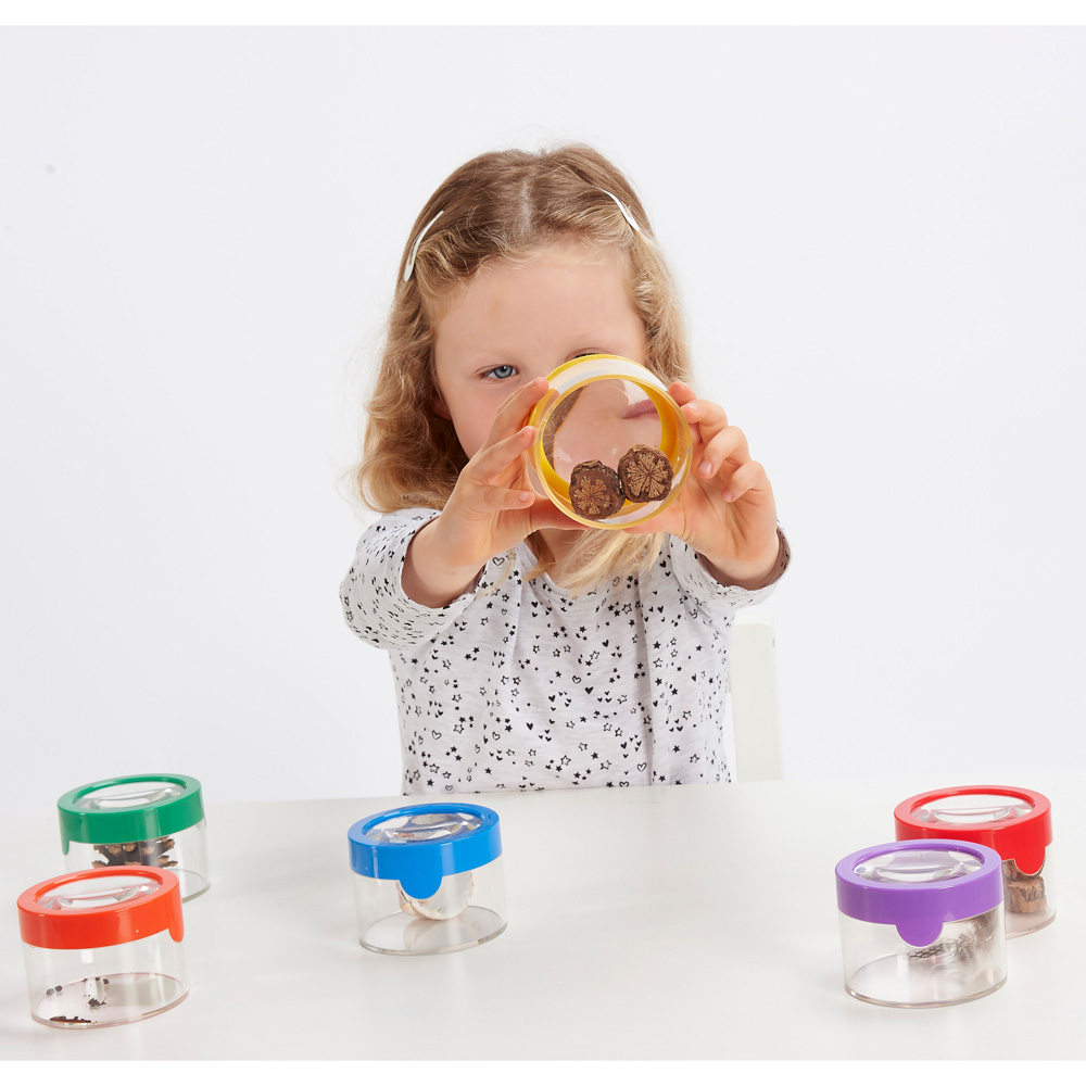 Sex färgglada luppburkar som lockar till undersökande aktiviteter ute i naturen.