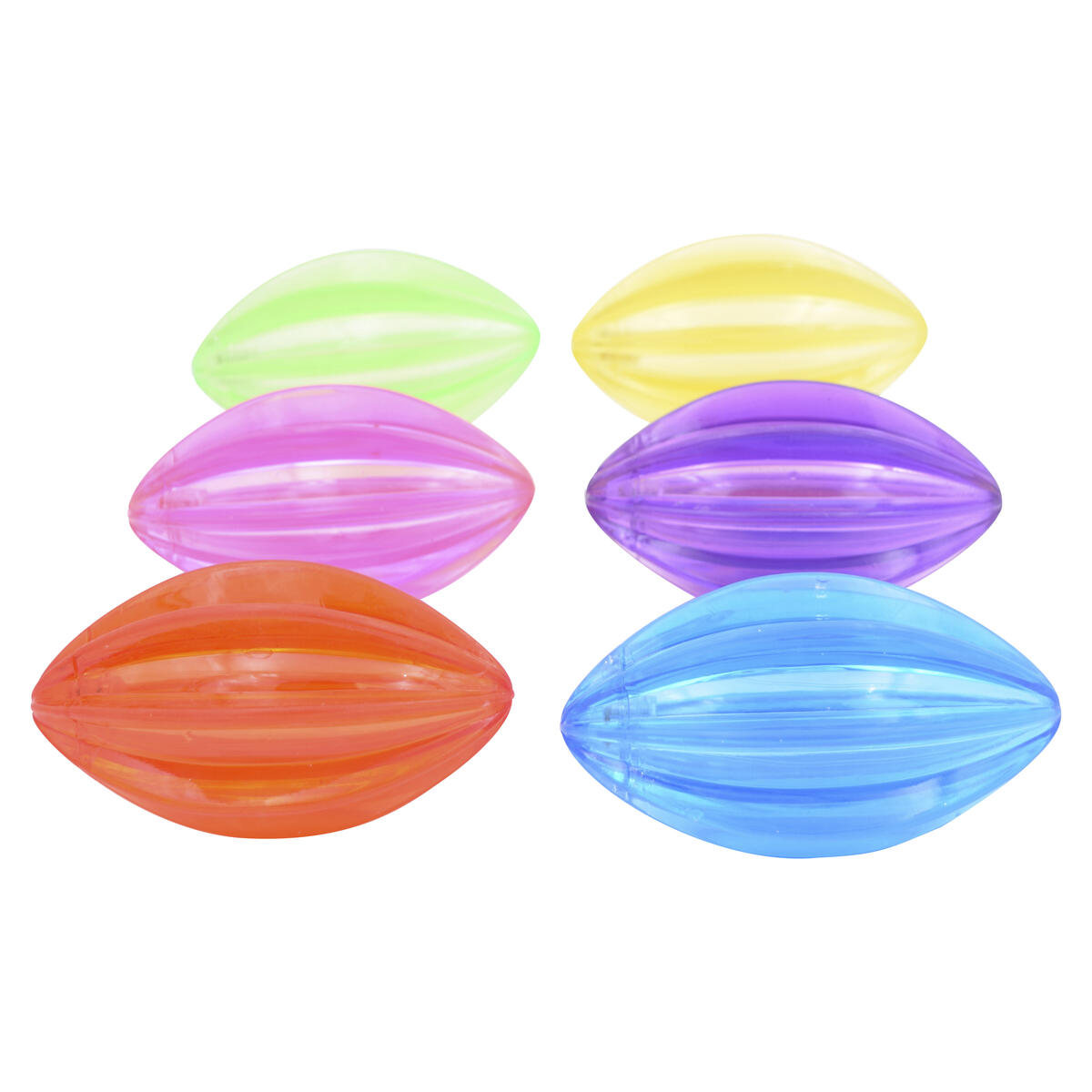 Formen gör bollen lätt att hålla, men den taktila räfflade ytan som gör att bollen studsar oförutsägbart gör den extra utmanande. Använd den i ett mörkt rum, studsa den i golvet (då börjar den lysa) och försök att fånga den. Kommer i olika färger. Mått: 13,5×8 cm.