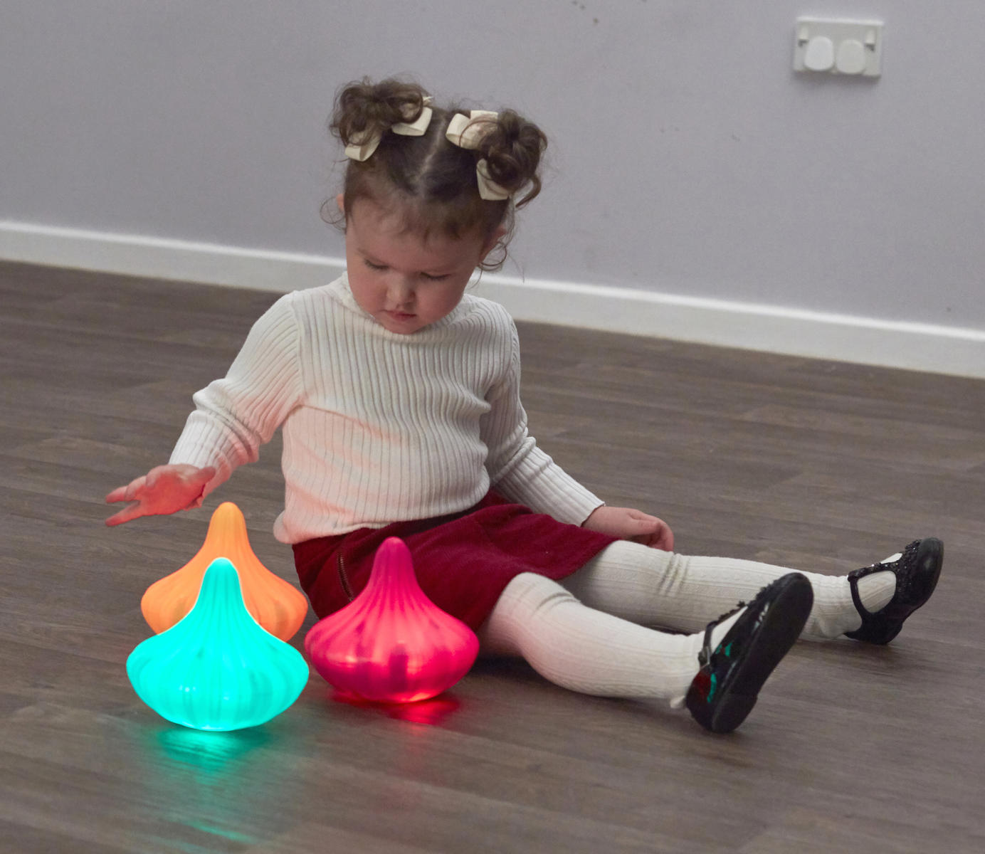 3 snurror som lyser i olika färger när man snurrar dem. Färgerna framkommer extra bra i ett mörkt rum/tält. Snurrorna laddas enkelt i den medföljande laddningsstationen. De är fullt laddade efter 3-4 timmar.