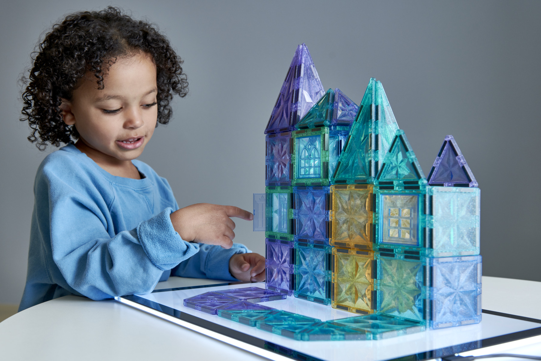 110 delar. Ett stort byggset i glittrande färgskala. Byggplattor med prismor och tillbehör som fönster, dörrar och bilar. Magnetisk bygglek tränar rumsuppfattning, finmotorik och fantasi. Byggbeskrivning medföljer. Av ABS. PVC-fri. Från 3 år.