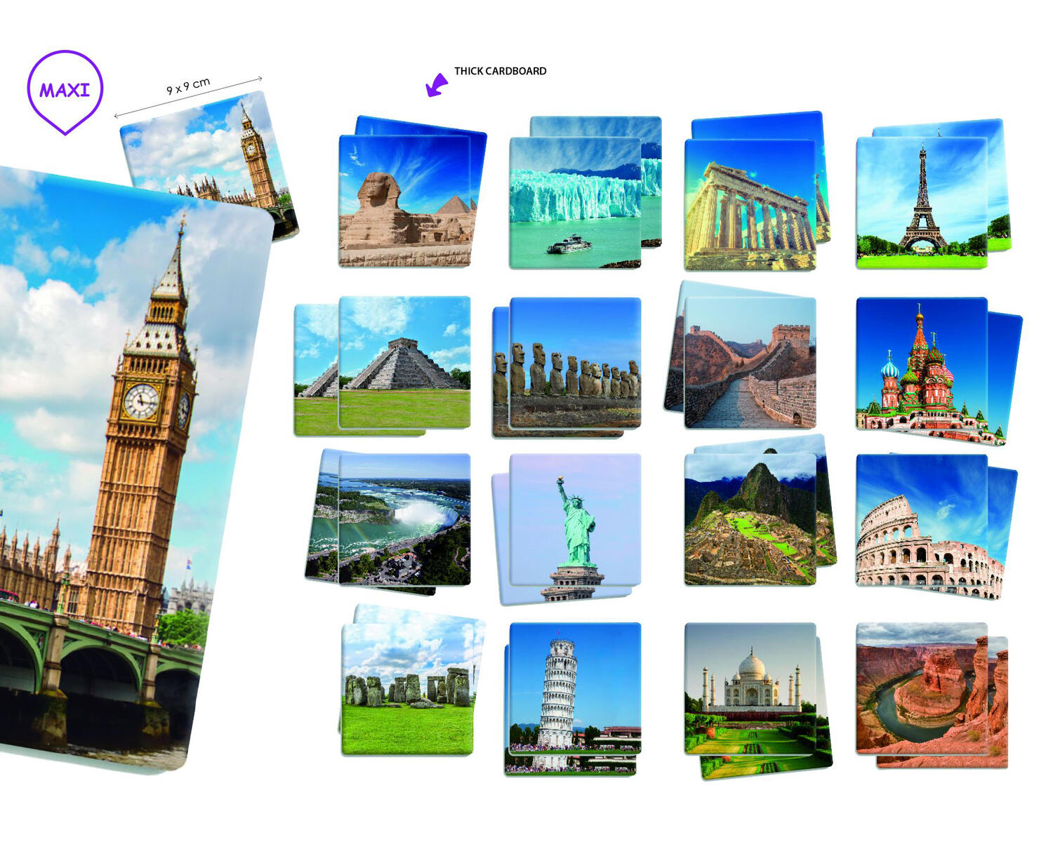 Med detta memo tränar barnen sitt arbetsminne och sin koncentrationsförmåga. Med motiv på olika platser i världen passar det lite äldre barn. Av kraftig kartong. Innehåller 34 kort som bildar 17 par. Mått: 9×9 cm.