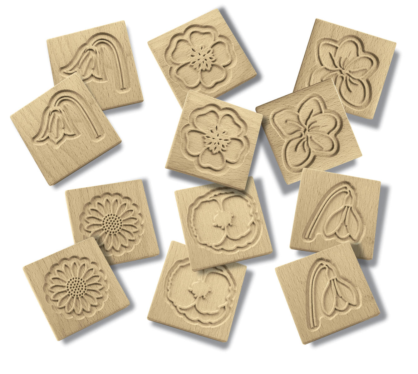 12 st/fp. Träplattor med taktila mönster av olika blommor. Spela memory, diskutera och utveckla språket, skapa mönster inom bild eller ta avtryck för lera. Innehåller sex olika bladpar: blåklocka, smörblomma, tusensköna, vallmo, snödroppe och viol. Av FSC-märkt bokträ. Mått: 6×6 cm. Från 18 månader.