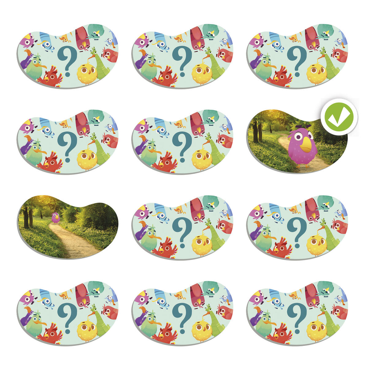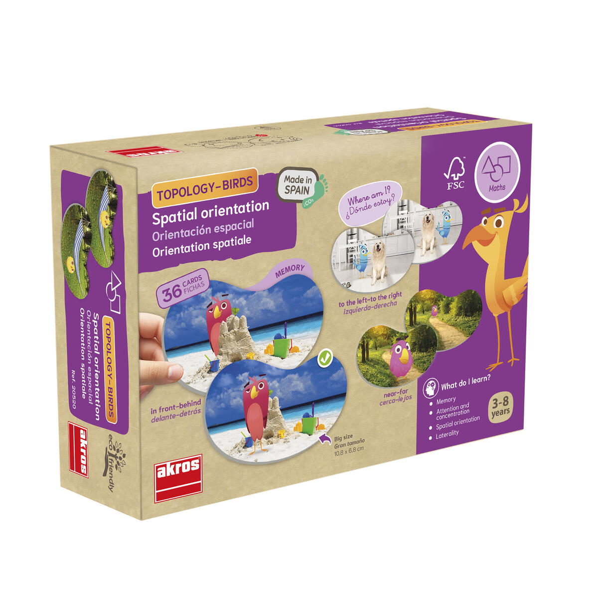 Ett memory där rumsuppfattning och lägesord tränas, t.ex. framför/bakom, inuti/utanför, höger/vänster och nära/långt borta.