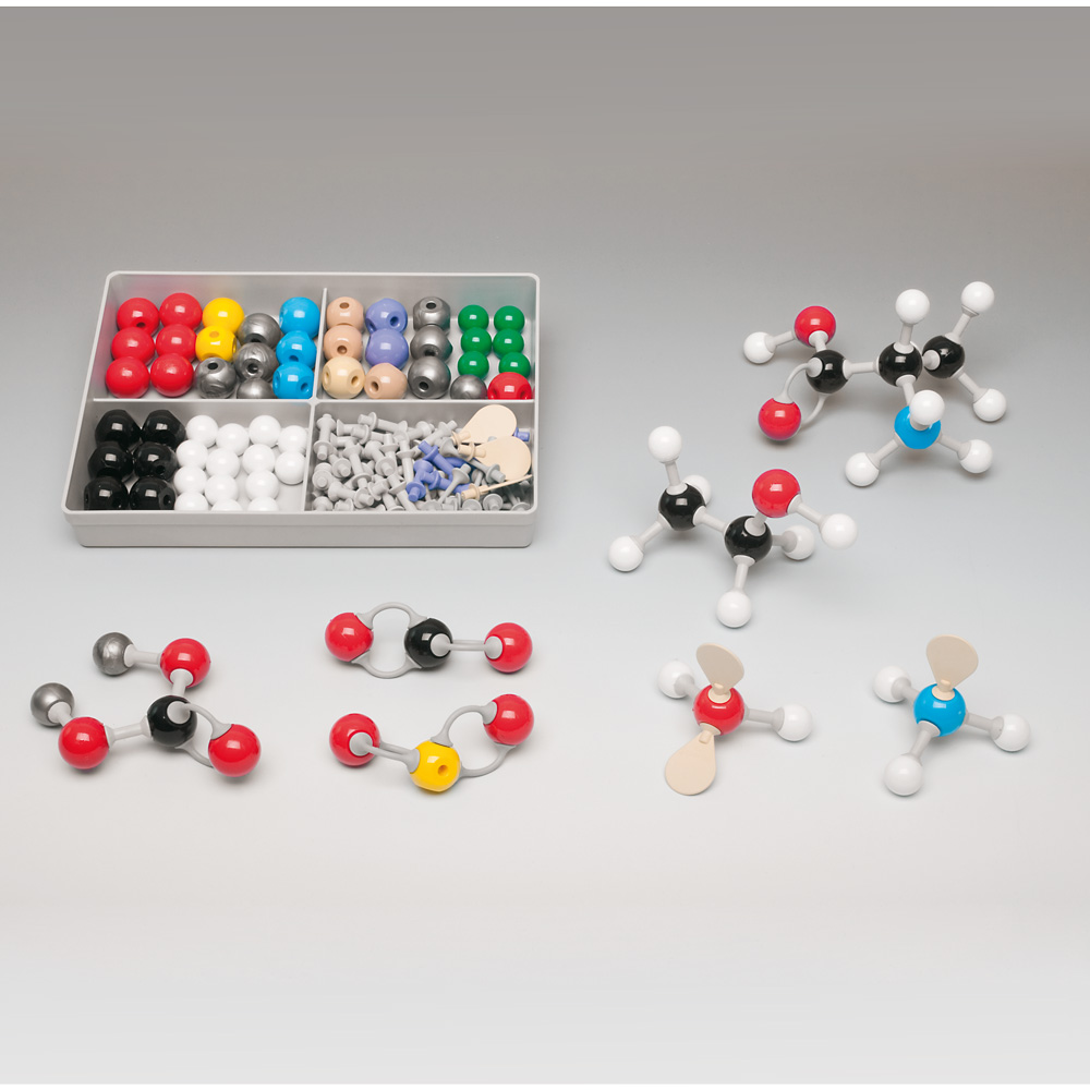 Molekylmodell för grundläggande arbete med organiskt/oorganisk kemi: kalcium, magnesium, beryllium, tre olika metallatomer (III, IV och V-värdiga), halogener, syre, bor, kväve, svavel, fosfor, väte och kol.