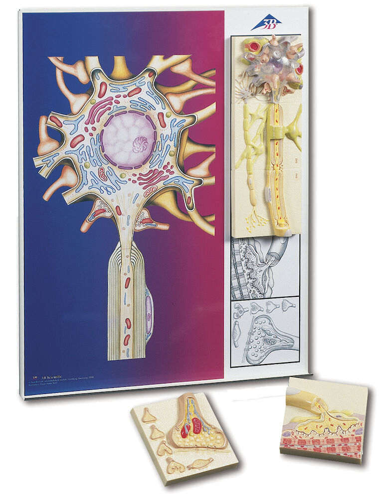 Visar de grundläggande strukturerna i det mänskliga nervsystemet. Var och en av de fem sektionerna av nervmodellen visar en plastfärgad reliefmodell av de viktigaste synapsvariationerna. Alla sektioner av nervfysiologiserien kan magnetiskt fästas på den illustrerade basen som visar de neurala komponenterna i livfulla färger. Varje nervsektion finns också separat. Setet innehåller följande avsnitt: Neuroncellkropp, Myelinhöljen i CNS, Schwann-celler i PNS, Neuromuskulär förbindelse med tvärstrimmig muskelfiber avbildas och Synaps. Nervserien nervfysiologi visar också 5 mindre reliefmodeller av de viktigaste synapsvariationerna. Vikt 4.38 kg. Storlek 68 x 51 x 3 cm.