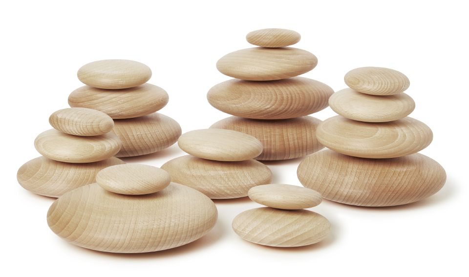 Förpackning med 20 stycken ovala "stenar" av trä.