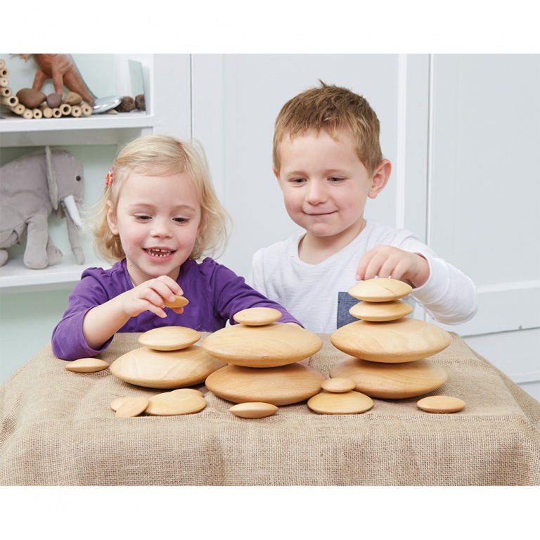 Vackra träovaler i olika storlekar att stapla, rulla och sortera. 20-pack.