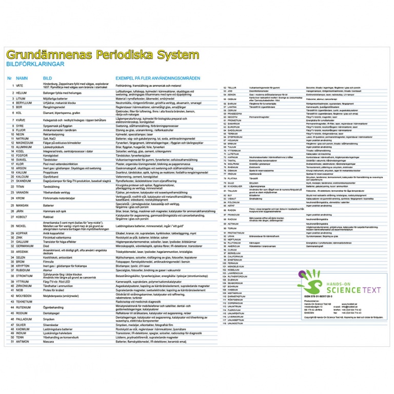 Svensk version med spännande bilder på varje ämne och exempel på produkter i vår omgivning som innehåller grundämnet.