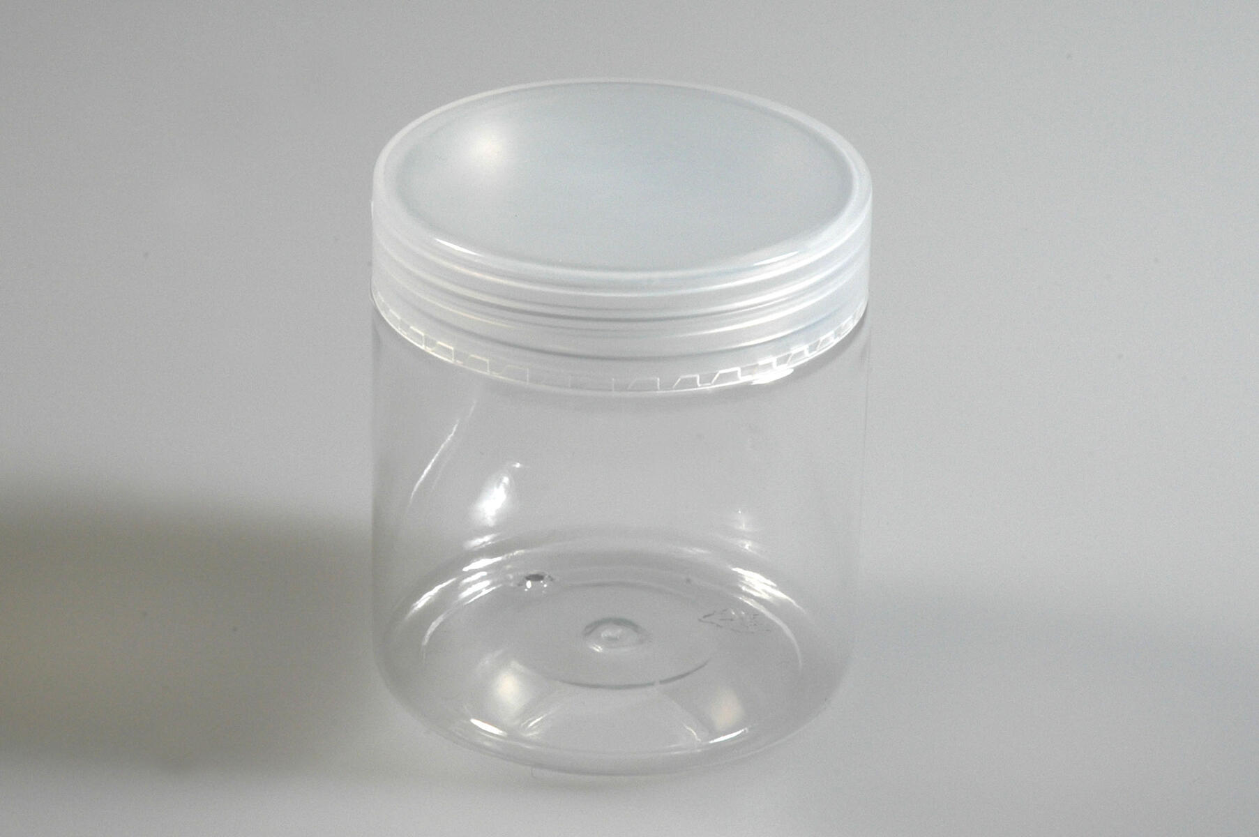 Vattentät burk med lock. ø = 68 mm, Höjd 70 mm. 180 ml. Av PET och PE.
