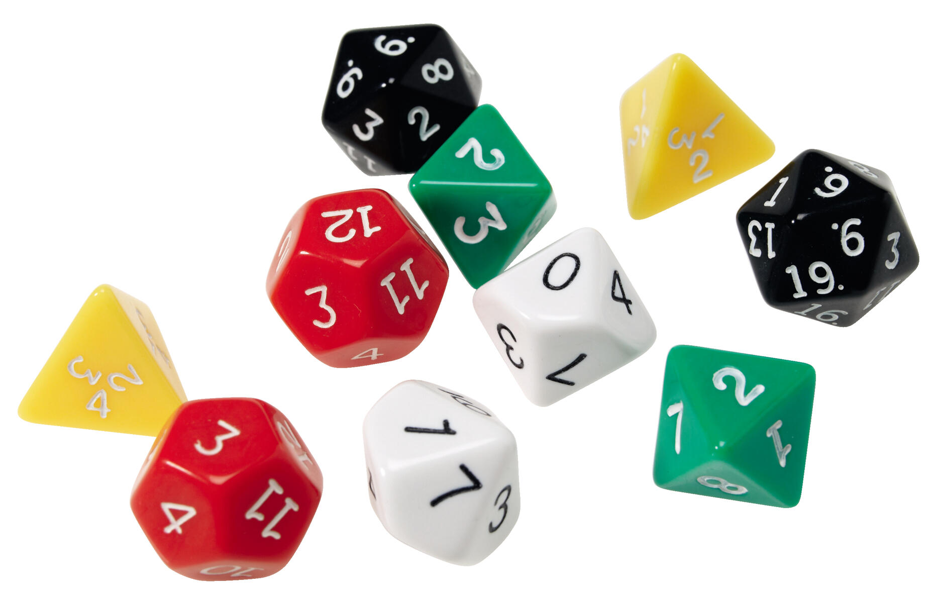 12 st/fp. Av akrylplast. 2 gula = 4-sidiga, 2 blåa = 6 sidiga, 2 gröna = 8-sidiga, 2 vita = 10-sidiga, 2 röda = 12-sidiga, 2 svarta= 20-sidiga. Från 6 år.