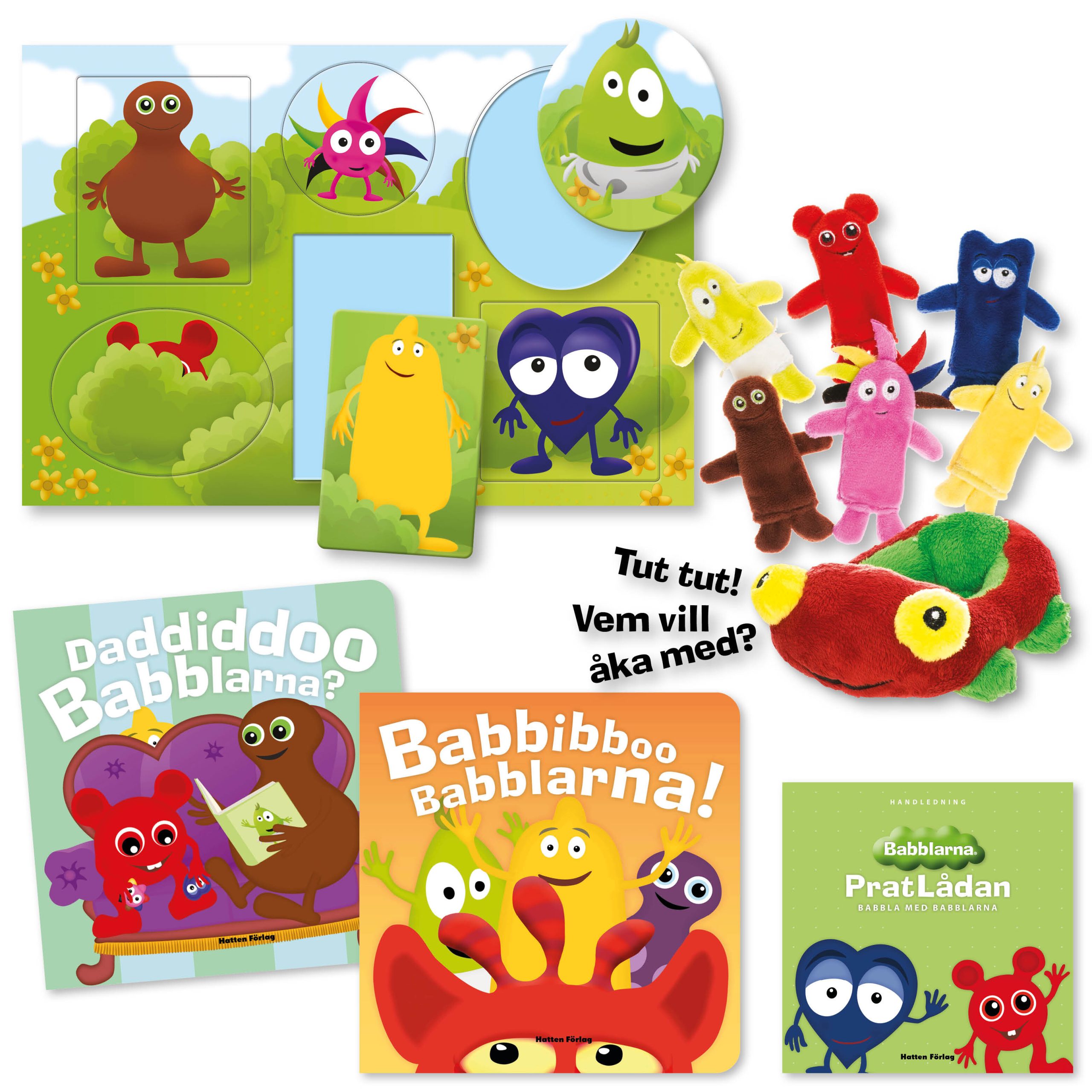 En härlig låda fylld med material att prata kring och leka med. Lådan innehåller följande: Babblarna fingerdockor – lek och låt fantasin flöda! 8-10 cm. Bilen Tut – vem vill åka med? Alla fingerdockorna får plats! Tittutpussel med Babblarna som gömmer sig bakom buskarna i Babblarnas dal, men vips tittar de fram när du vänder på pusselbiten. Roligt tittutpussel för de minsta. Pratboken Daddiddoo Babblarna där vi får träffa Tut och Babblarna och titta in i Babblarnas hus, men hela tiden är det någon som saknas. Vem? Peka, berätta och babbla på! Pratboken Babbibboo Babblarna. Vad gör Babblarna? Vem gömmer sig bakom soffan? Vem är det som har mustasch? Vem åker högst i berg och dalbanan?