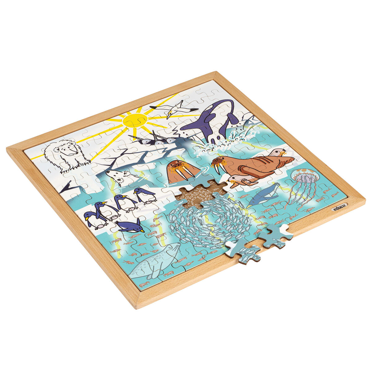 Placera pusselbitarna på rätt ställen och diskutera vad du själv skulle kunna bidra med till en bättre miljö. Med pusslet och diskussionen förbättras ordförrådet, den rumsliga medvetenheten och ögon-handkoordination. 100 bitar.