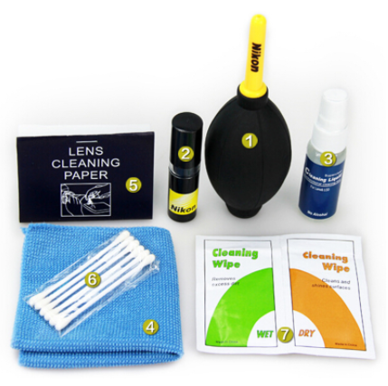 Rengöringskit för optik, t.ex. mikroskop, kamera, kikare, teleskop m.m. Rengöringsvätska, luftblåsare, mikrofiberduk, borste, bomullstops, linspapper och våtservetter. Av silikon, PP och nylon.