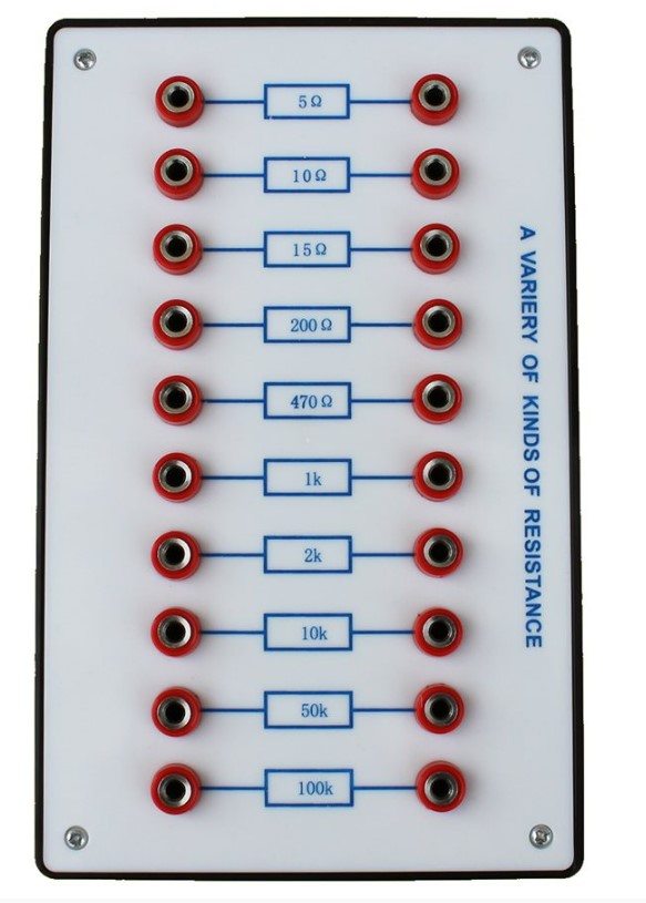 En box med 10 färdiga resistansvärden för laborationer och demonstrationer inom ellära, ansluts med labbsladdar med 4 mm banankontakter