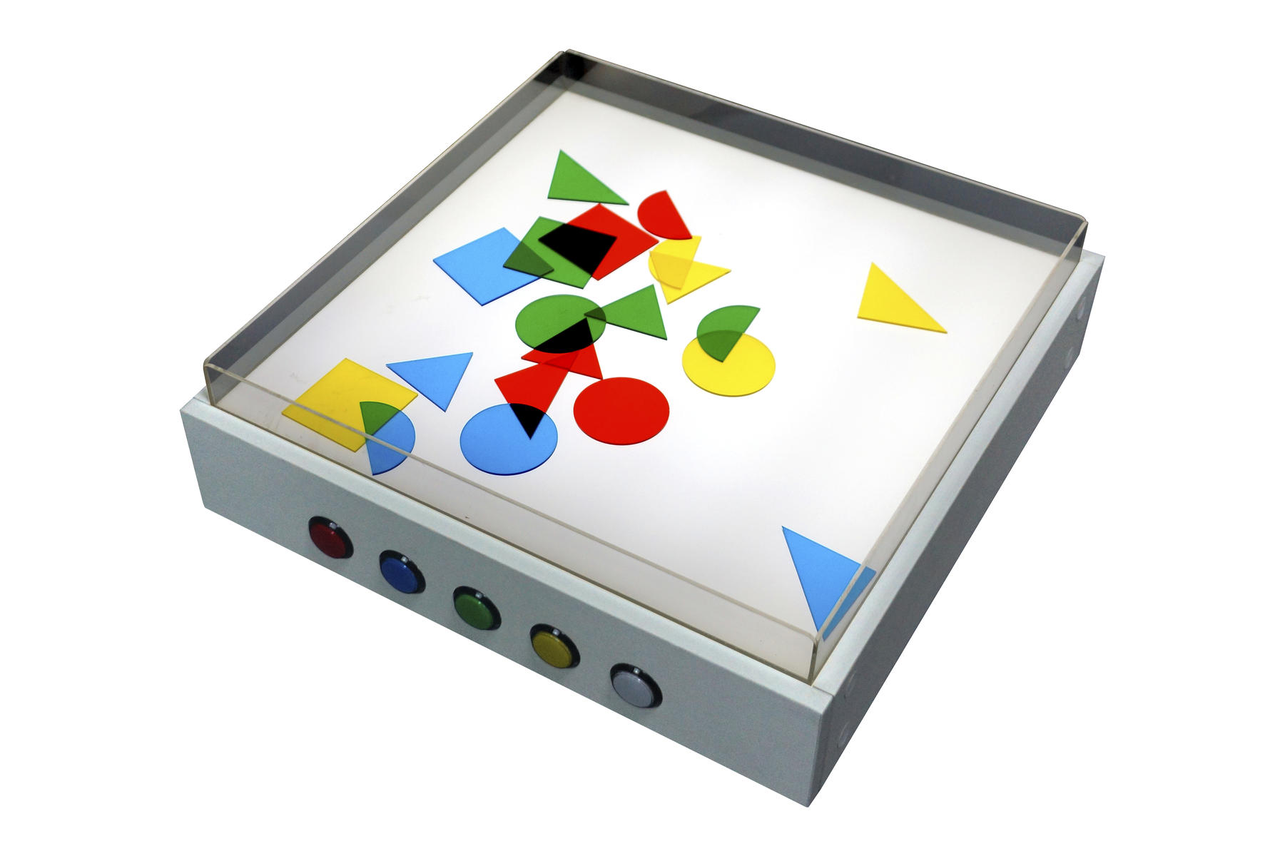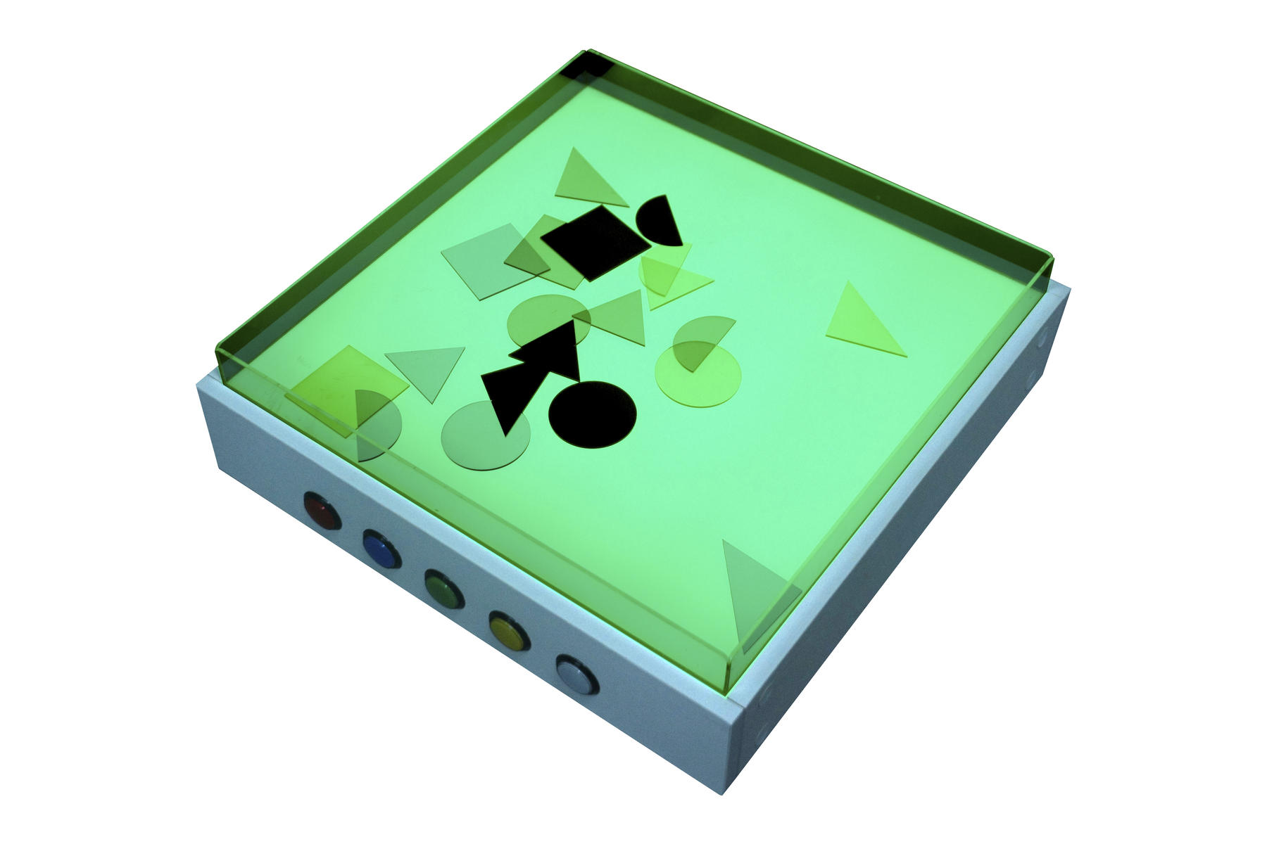 Ett stabilt ljusbord med tillhörande tråg för taktila och sensoriska projekt med färg, form och material. Ljusbordet kan användas på ett bord eller direkt på golvet. Ändra färg med en enkel knapptryckning på sidan av ljusbordet.