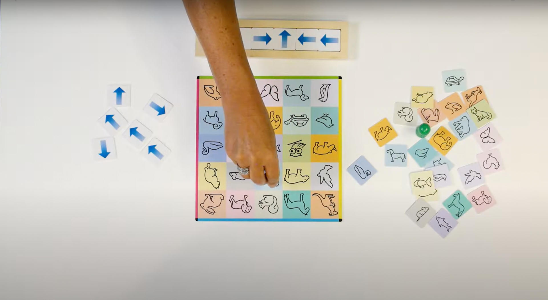 Välj ett djur på spelbrädet och sedan vilken riktning djuret skall gå med hjälp av pilkorten. Låt sedan din motspelare lista ut kodsekvensen för att försöka hitta samma spelruta. När barn har lärt sig innebörden av pilar och riktning är Coding in steps ett naturligt steg i en introduktion till programmering i tidig ålder.