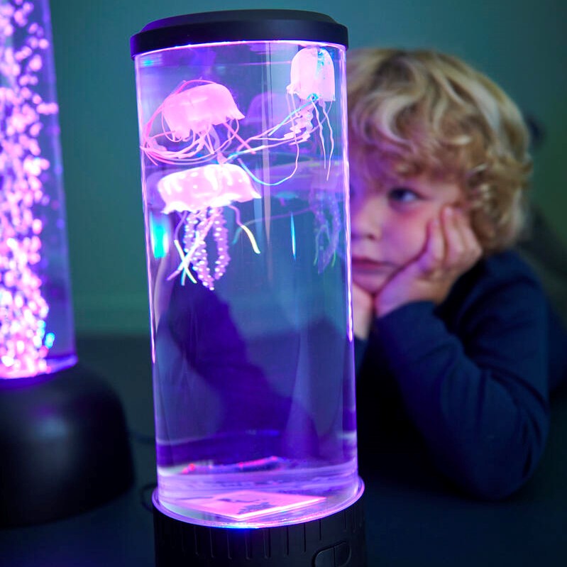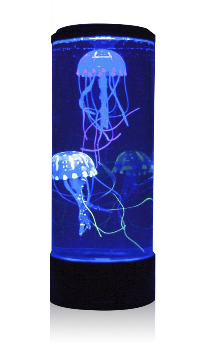 Ett upplyst akvarium med maneter. Det finns olika belysningsalternativ: att ha en färg eller en ljusshow på 6 olika färger. De konstgjorda maneterna rör sig på ett naturligt och realistiskt sätt. Luftpumpen trycker in luft i vattnet vilket gör att maneterna rör sig. LED-lampor.