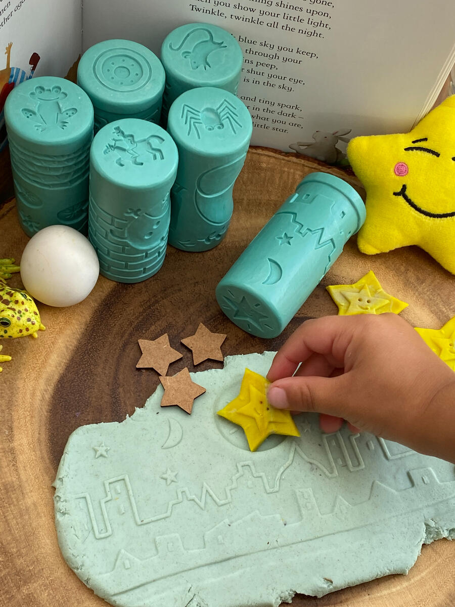Rulla i lera eller sand och stämpla kortsidan för att få fram de ingraverade motiven. På dessa rullar finns ramsor och sånger: Blinka lilla stjärna, Hickory Dickory Docka, Imse vimse spindel, Fem små grodor och Hjulen på bussen. 6st/fp