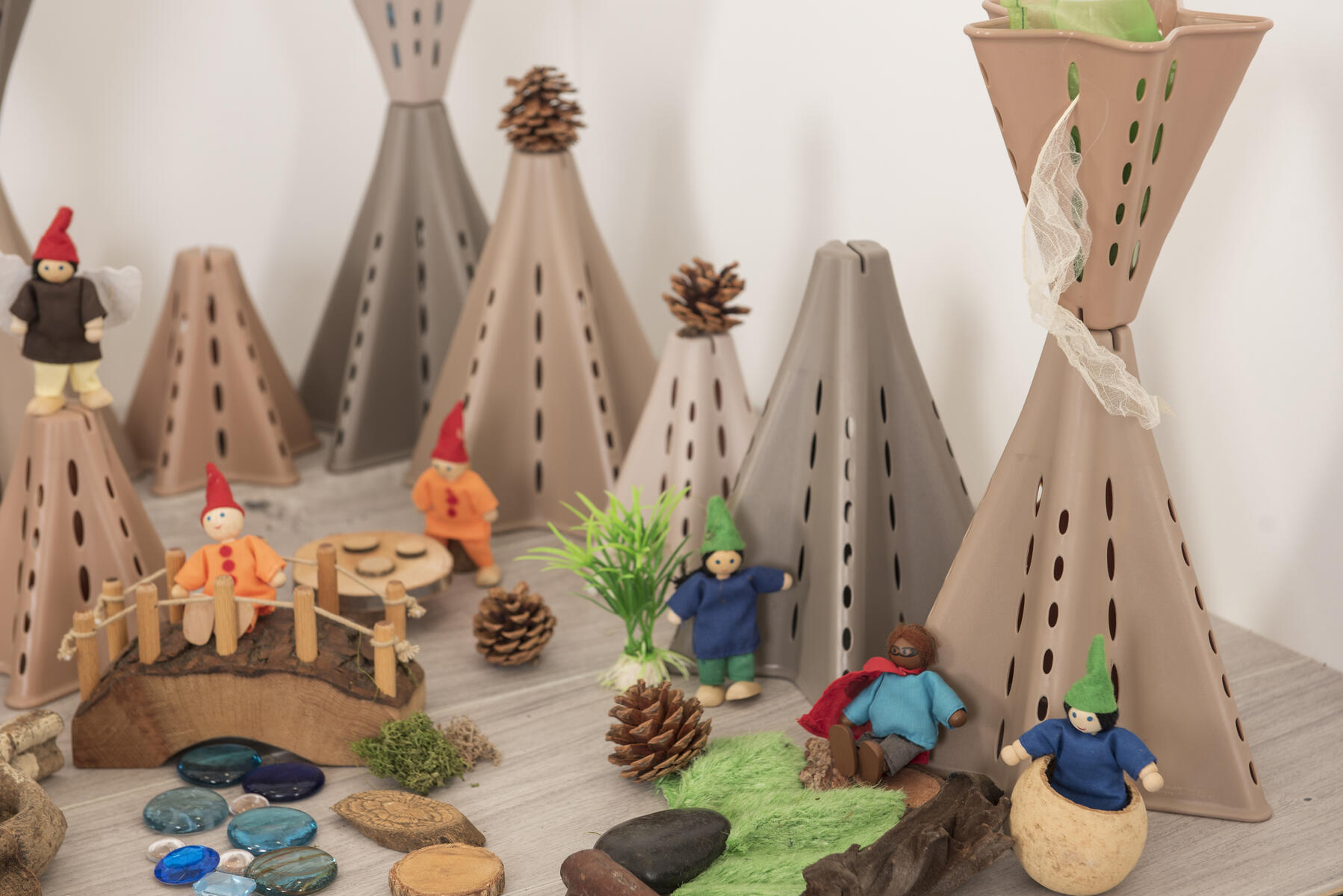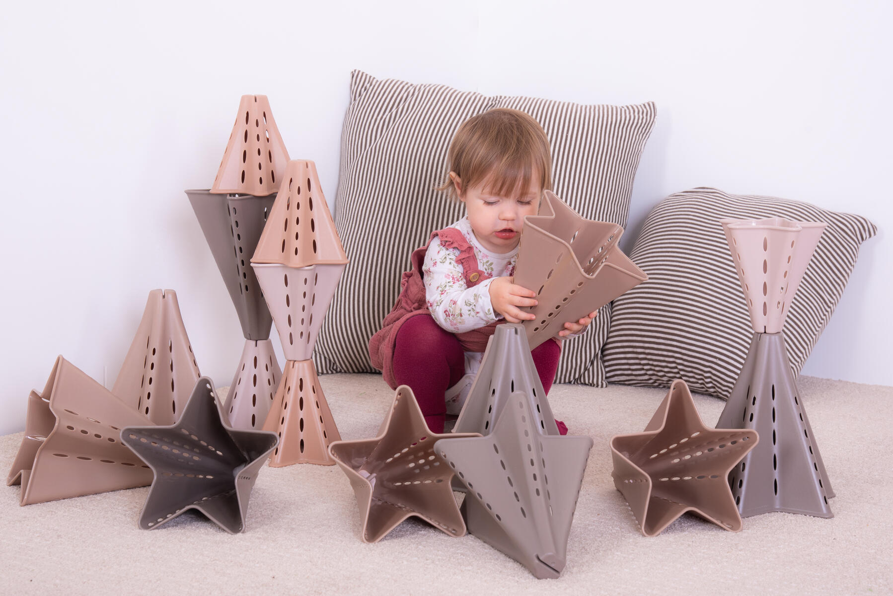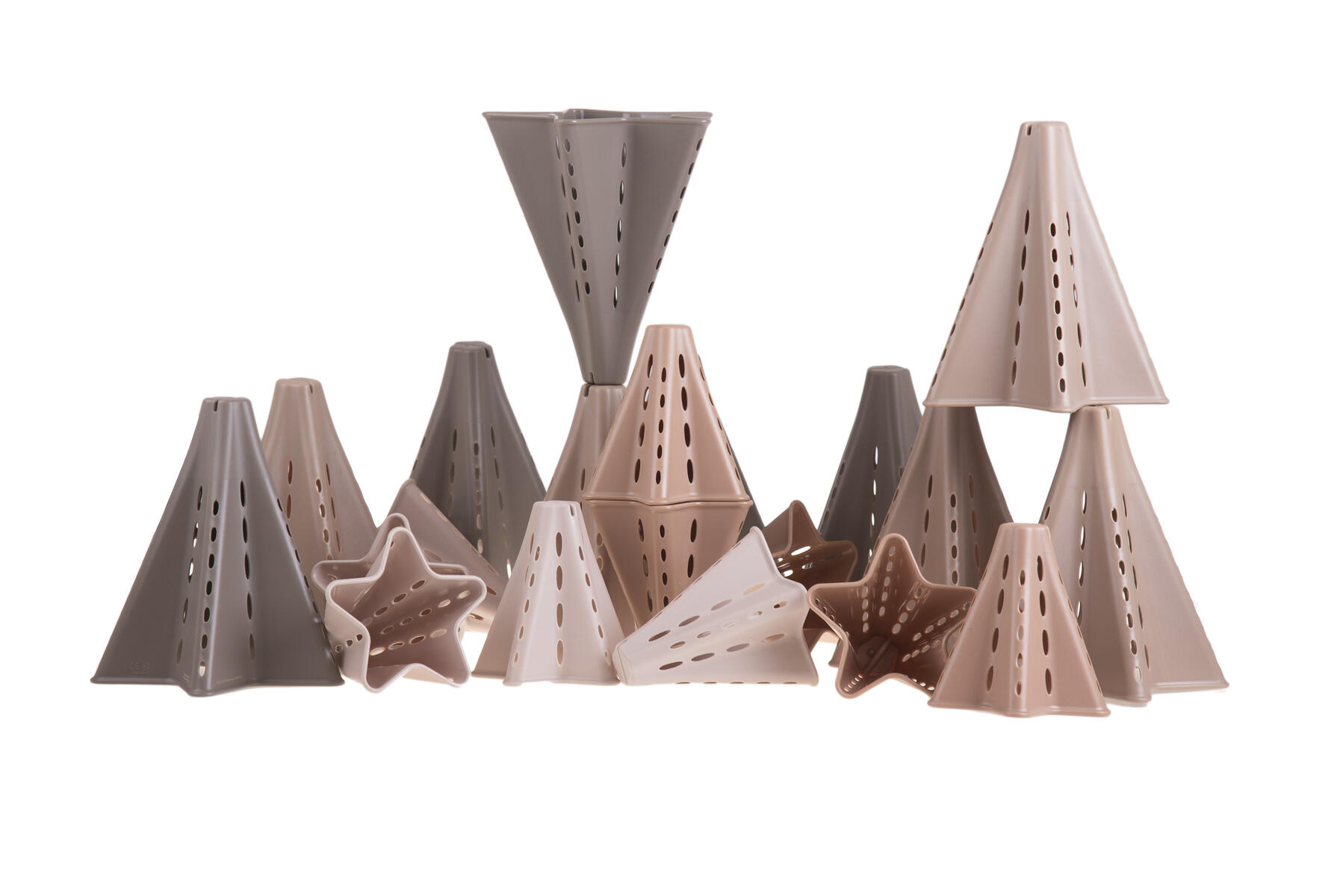 Koner i fina jordfärger. Bygg för att se hur högt torn det kan bli. Ta med dem ut och använd i sand eller vatten.