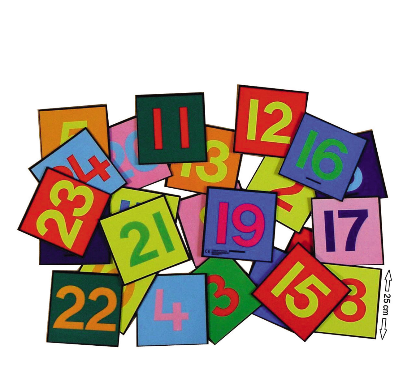 Innehåller 24 numrerade, färgglada, kvadratiska mattbitar i måtten 25×25 cm. För roliga och aktiva mattelekar, t.ex. att hoppa på en speciell siffra eller byta plats.