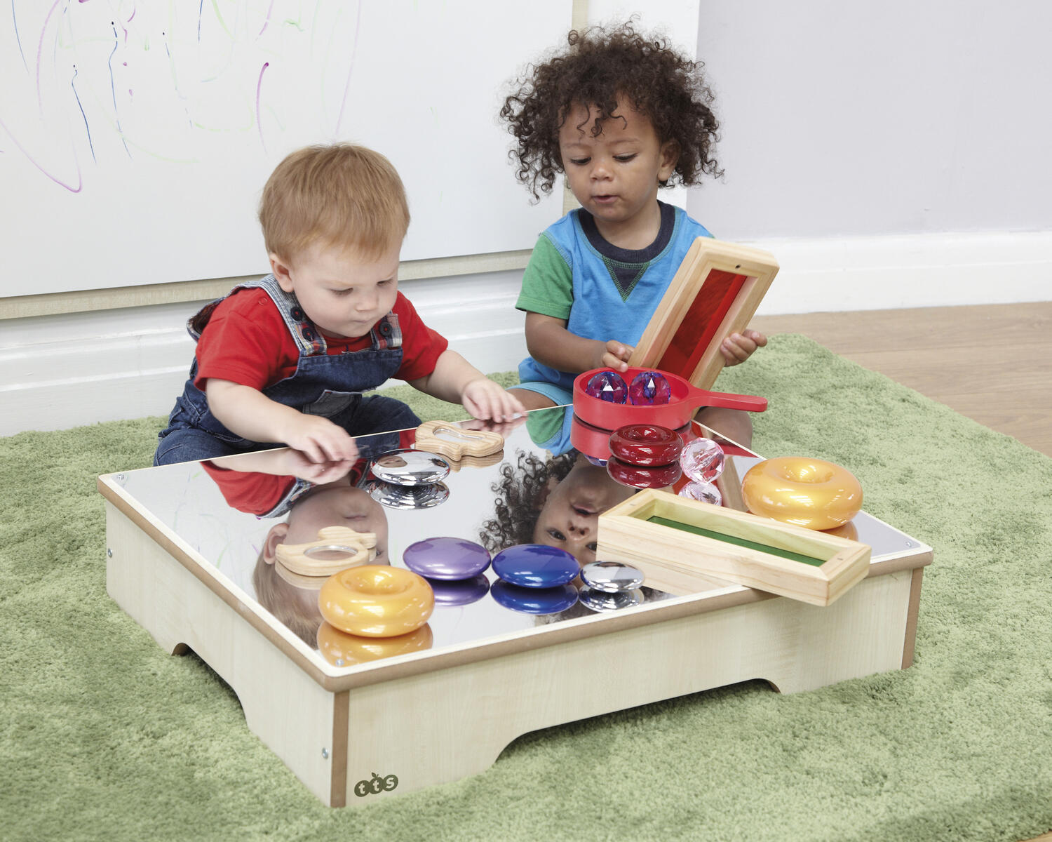 Detta låga bord är till för att barn ska kunna utforska och experimentera. Med t.ex. byggklossar på bordet reflekteras konstruktionen och ger helt nya perspektiv. Bordet har rundade kanter och passar många olika aktiviteter i olika åldrar. Den reflekterande, robusta akrylspegeln väcker intresse och engagerar. För användning inomhus och med fördel på mjuka underlag, då vassa föremål kan repa ytan. Rengöres med mjuk trasa. Levereras omonterat. Mått: 66x51x14 cm. Från 1 år. Kräver enkel montering.