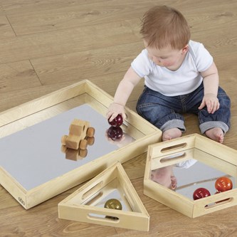 4 st/fp. En vacker samling av spegelformar i björkträ för att utforska reflektioner. Den speglande basen gör brickorna fängslande och de passar utmärkt för sortering. Brickorna är inte lämpliga att användas med sand eftersom det ger repor. Från 0 år.