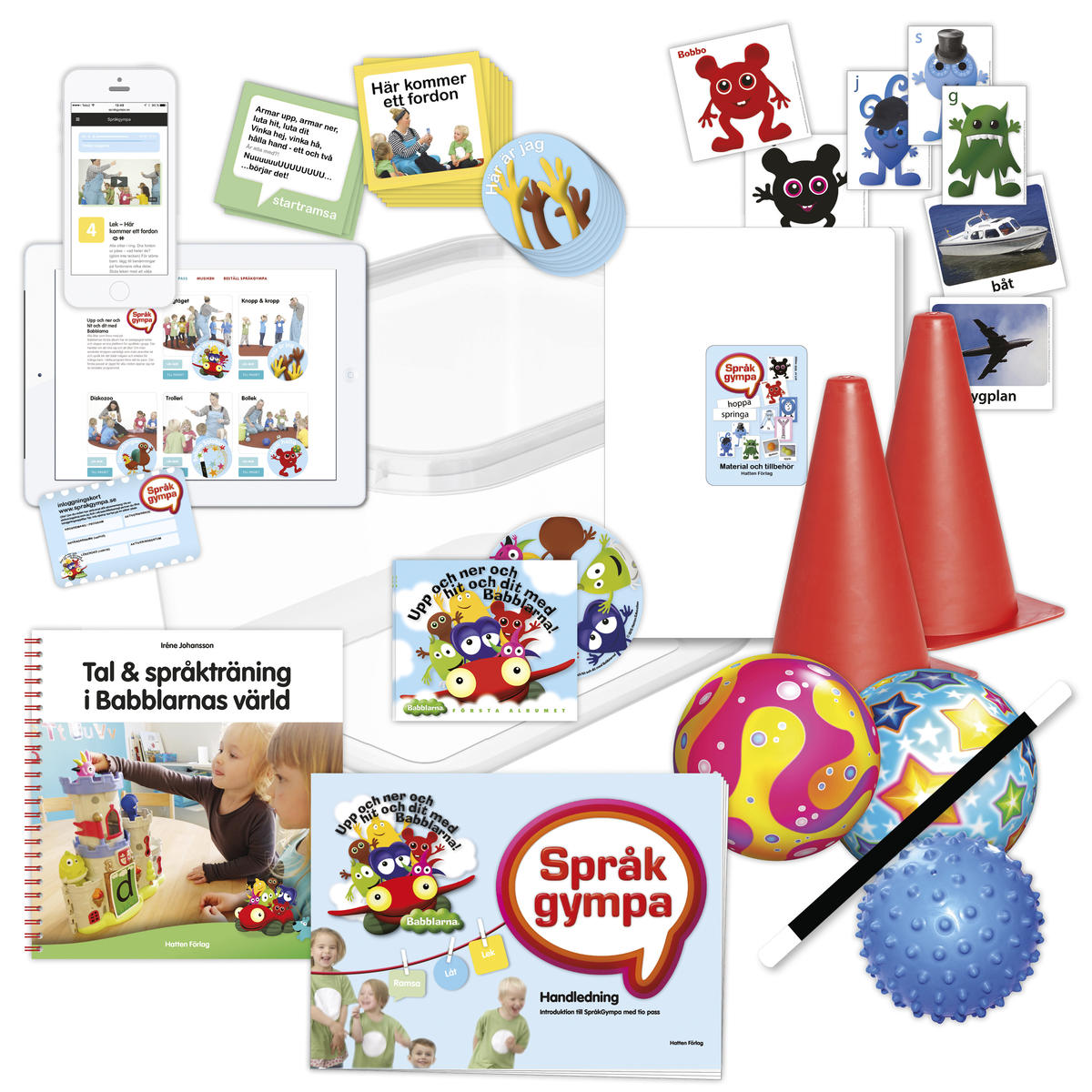 Med ”Babblarna Första Albumet” som bas och många olika material som stöd, får hela barngruppen leka med ljud, språk och motorik. Ledarlådan innehåller allt du behöver: Tryckt handledning med tio pass, boken ”Tal- och Språkträning i Babblarnas värld” av Iréne Johansson (fördjupning), CD med musiken som ingår i programmet, kort med lekar (för att kunna sätta upp på väggen och komponera ihop egna pass), mapp med diverse material som används till de olika passen, trollstav, tre bollar, fyra koner, påse att gömma saker och kort i.