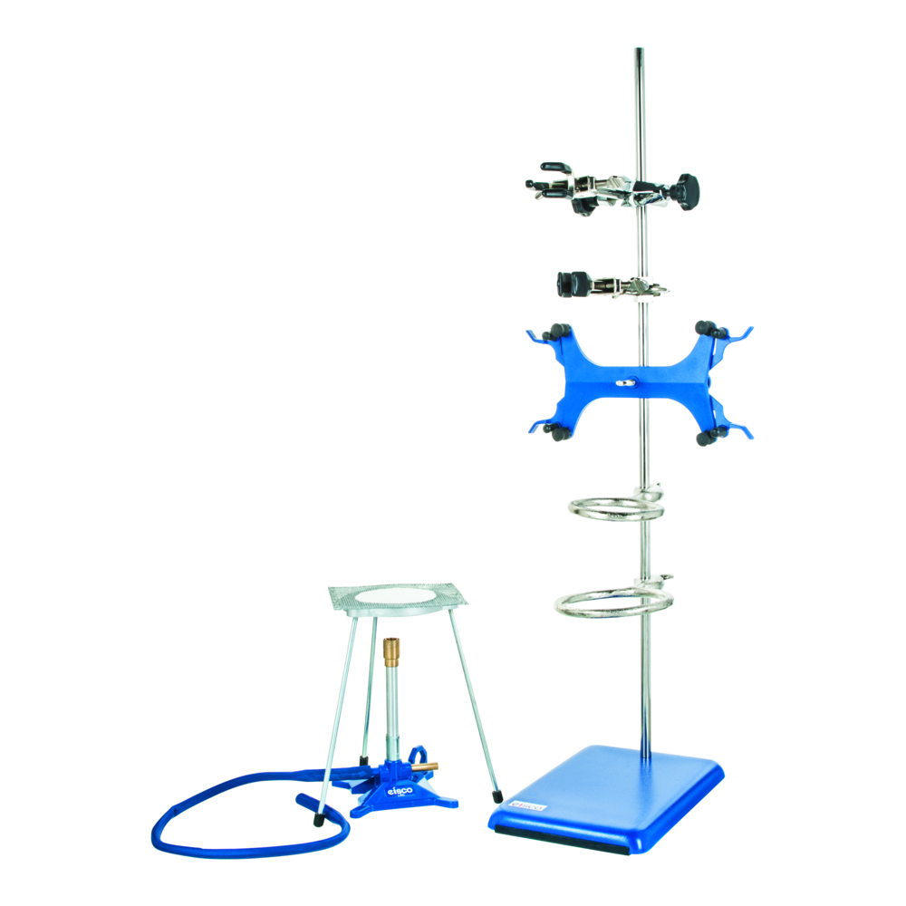 Ett komplett startset för ett laboratorie. Setet består av en stadig bas, stativ, dubbel byrettklämma, justerbara klämmor, tripodställ, bunsenbrännare.