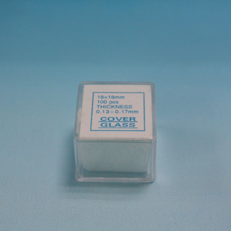 Täckglas för mikroskop, storlek 18×18 mm, tjocklek ca 0,13-0,17 mm.