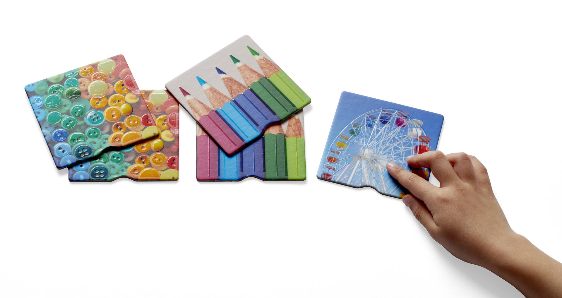 Kort med olika textur som kan spelas som ett vanligt memory men också genom att med ögonbindel försöka matcha paren.
