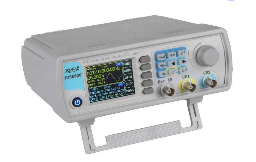 Tongenerator med olika Signalformer, Sinus, fyrkant, triangel, puls, halvaxel, brus, Lorentz-puls, exponentiell ökning/avfall, CMOS, med mera. är en 2-kanals signalgenerator som genererar signaler på upp till 60 MHz. Den är med sina olika kurvformer, som t.ex. sinus, fyrkant, triangel, puls, Halvaxel m.m., kan användas inom alla mättekniska områden. Dessutom är en 1-kanals frekvensräknare integrerad. Den ger en utmärkt signalkvalitet och flexibilitet med en noggrannhet av ±20ppm och en stabilitet av ±1ppm/3h. Frekvensområde 0-6MHz Frekvensnoggrannhet ±20ppm Frekvensstabilitet ±1ppm/3h Stor TFT-färgskärm på ca 6cm. Ingår: Signalgenerator 2x anslutningskabel(40cm) BNC med krokodilklämmor. Nätenhet. Hölje i ABS.