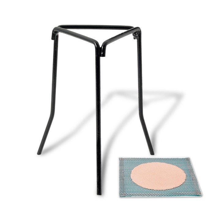 Paket med en Trefot av stål, höjd 20 cm, triangulär topp 13x13x13 cm. och nät av Keramiskt konunderlägg, mått 150×150 mm.